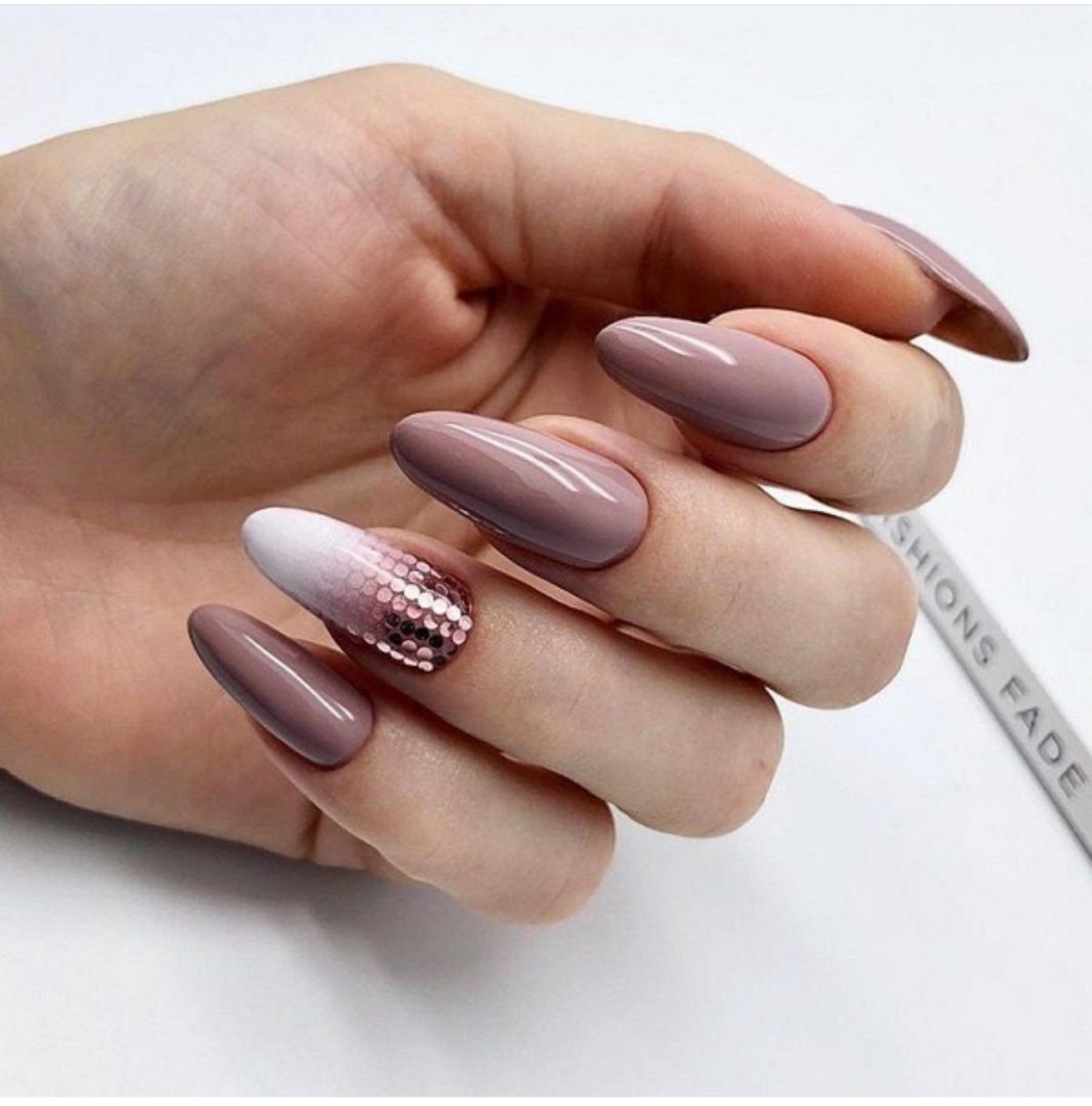 - Дизайн длинных ногтей с блестками. Блестки в этом зимнем сезоне на пике популярности, они станут отличной основой для стильного дизайна ногтей. С ними можно сделать френч, омбре или просто нанести светоотражающий лак.