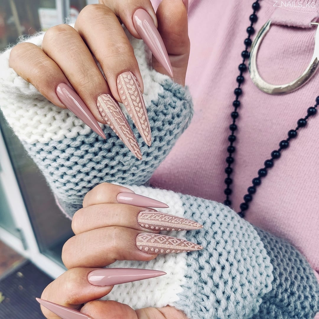 - Вязаный маникюр. Для создания красивого и эстетичного маникюра можно использовать тематические узоры и мягкие оттенки. Вязаный узор, напоминающий нам фактуру свитера и золотой блеск, подарит вам атмосферу сказки этой зимой.