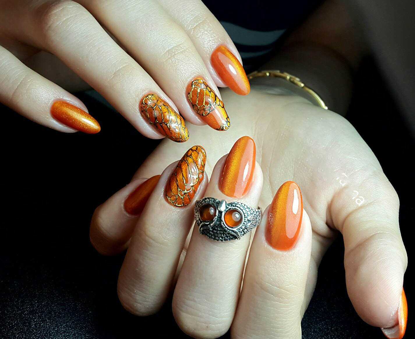 Оттенок, взятый непосредственно из красок осени. Он живой и яркий, придает энергию дням, которые становятся короче. Наклейка с изображением лисы сделает маникюр более игривым – нестандартный осенний маникюр.