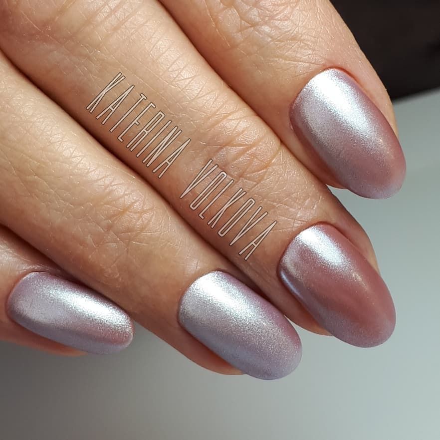 Глянцевую поверхность можно дополнить акриловой пудрой или песком, мелкими блестками или микробисером. Востребованным останется использование жемчужной или перламутровой втирки, которая сделает маникюр на овальные ногти по-настоящему сказочным и волшебным.