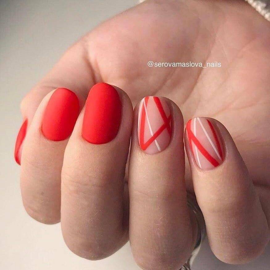 - Спортивный нейл-арт – вертикальные белые полосы на красном фоне;