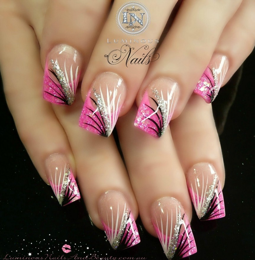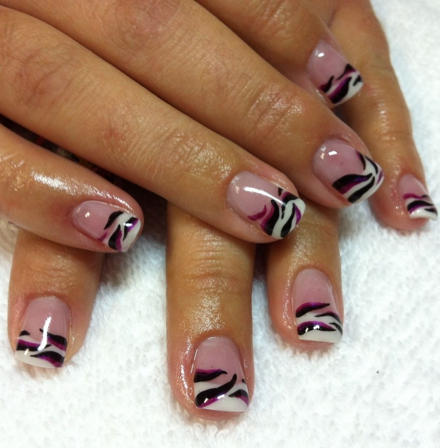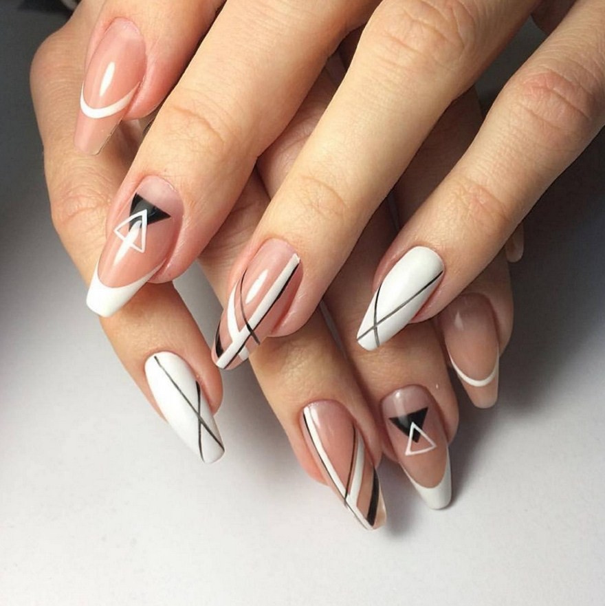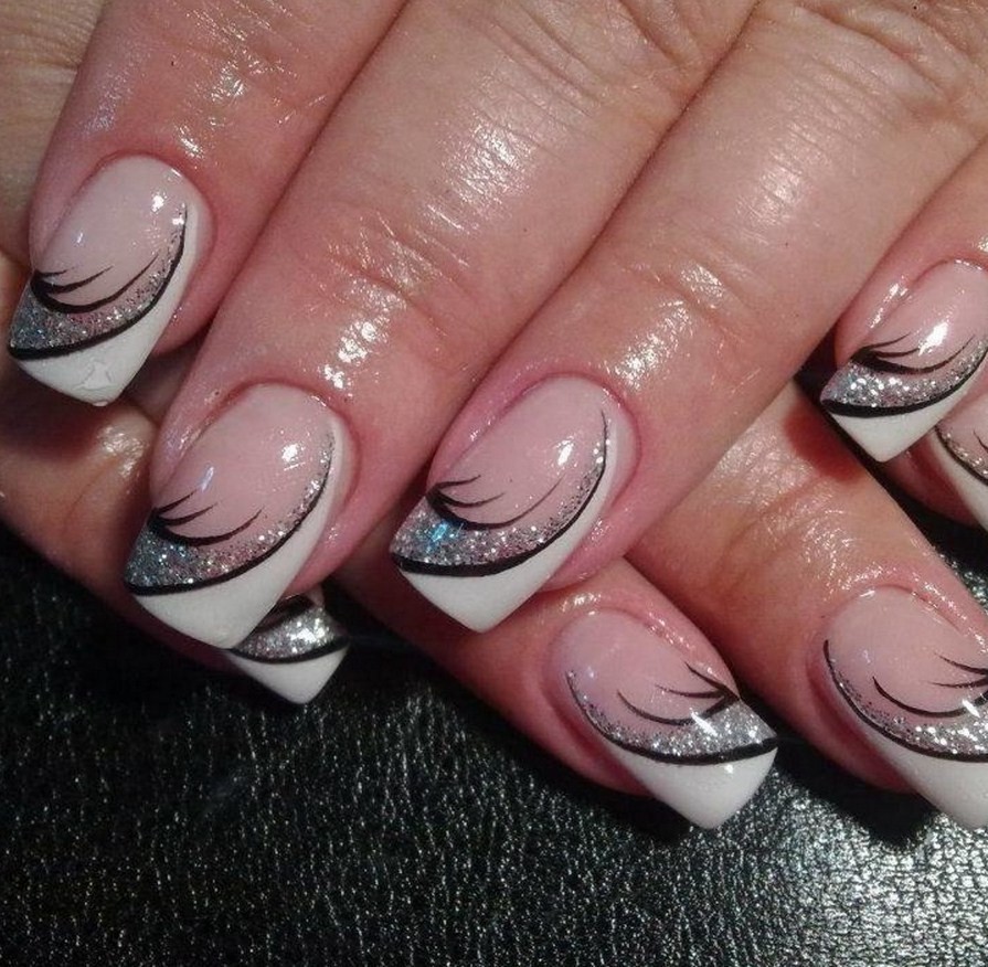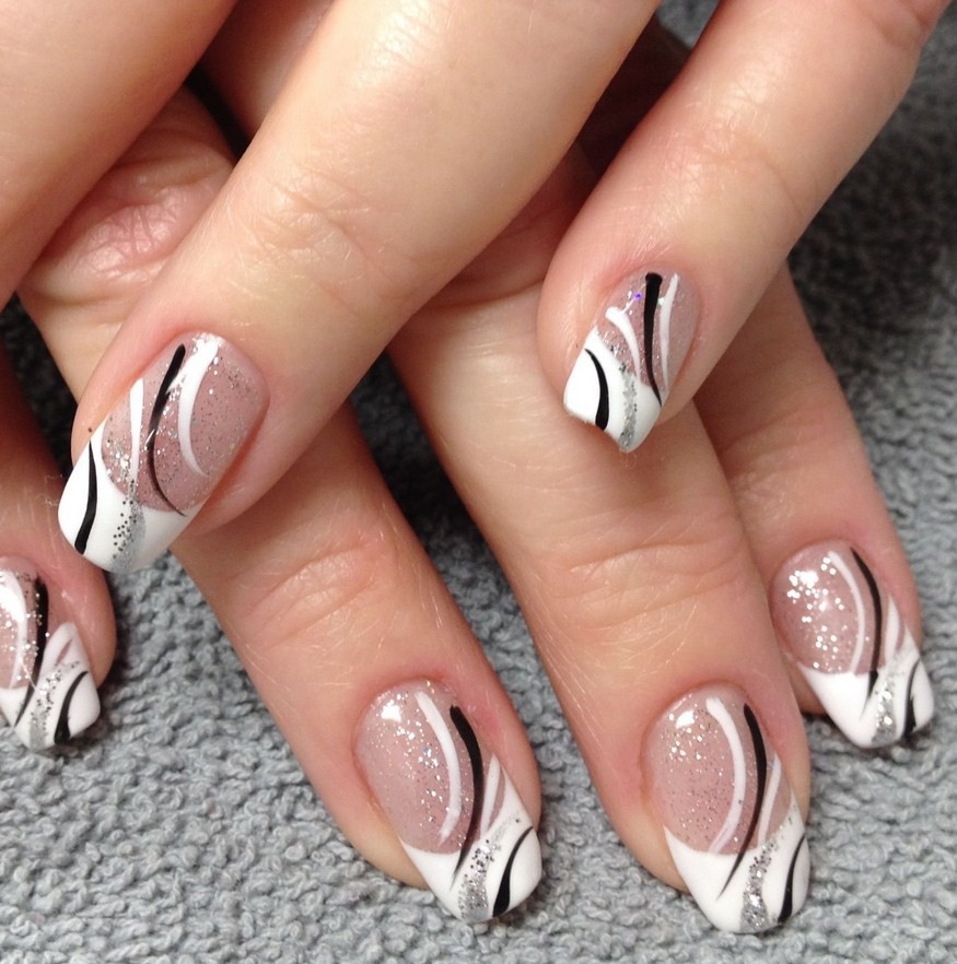 Абстракция на ноготках – это нанесение бесформенных линий, изображений. Полоски французского дизайна лучше делать белыми, а декор – более ярким.