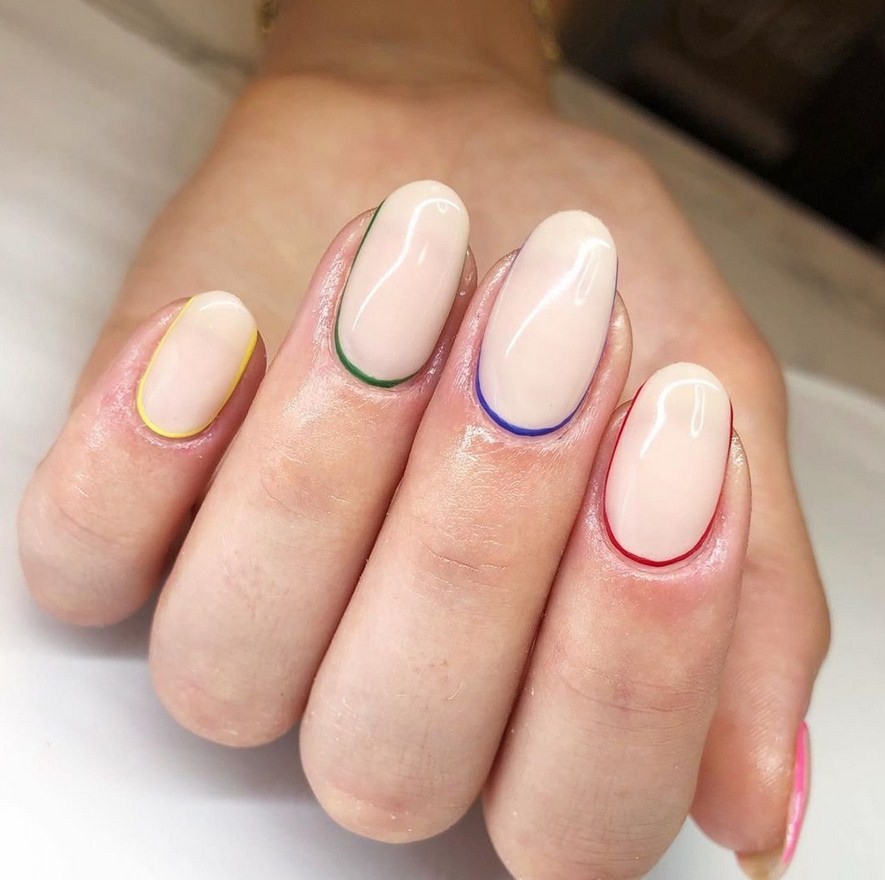 Разноцветный френч на коротком миндале может выглядеть нелепо и вульгарно. В предстоящих сезонах на такой форме не следует делать маникюр с использованием более 3 оттенков гель-лака.