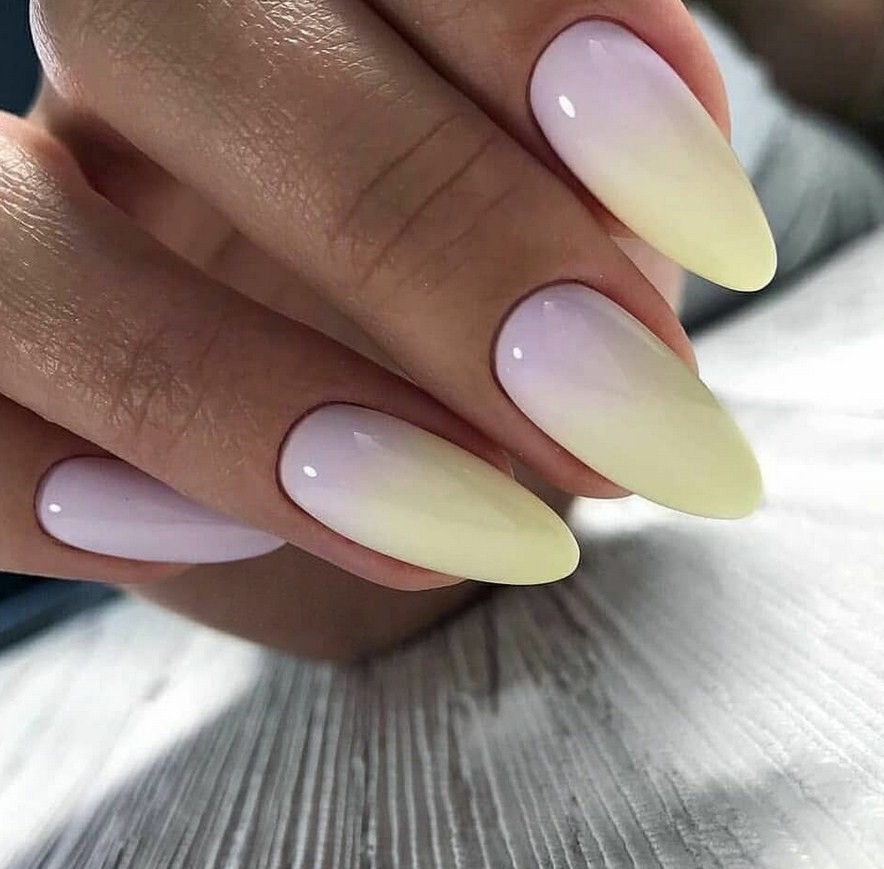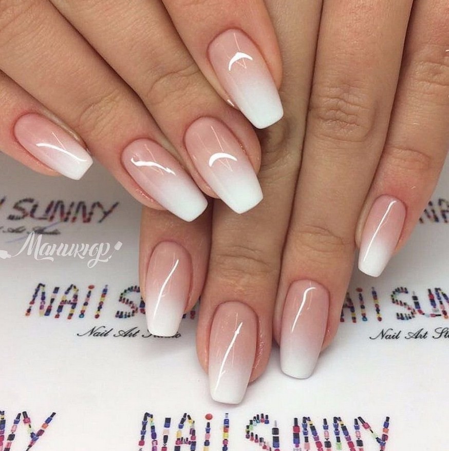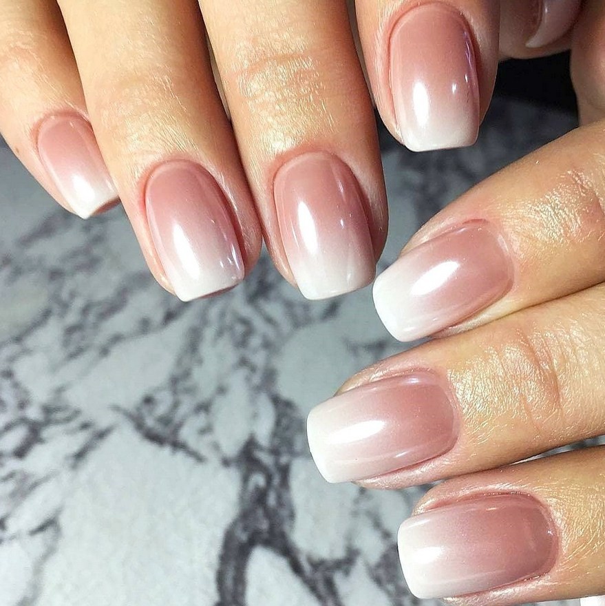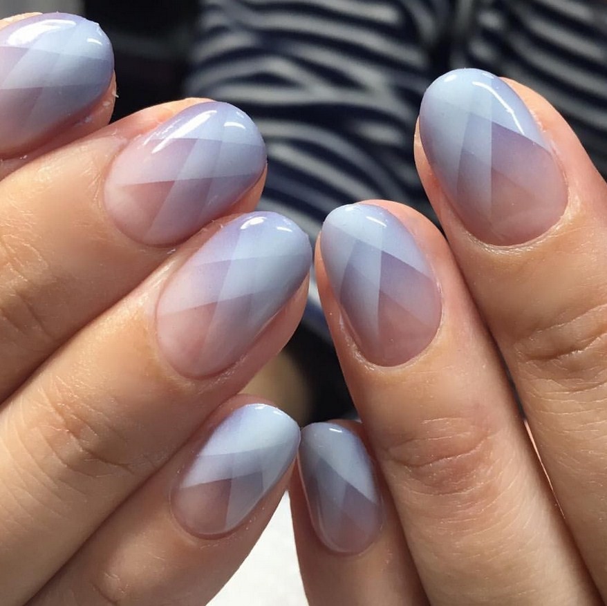 Особой нежностью на руках обладает эффект градиента. В основном используют светлые оттенки. Аккуратно исполненная растяжка добавляет рукам настоящую утонченность. Этот вариант отлично дополняют тонкими веточками, цветами, фольгой или блеском.