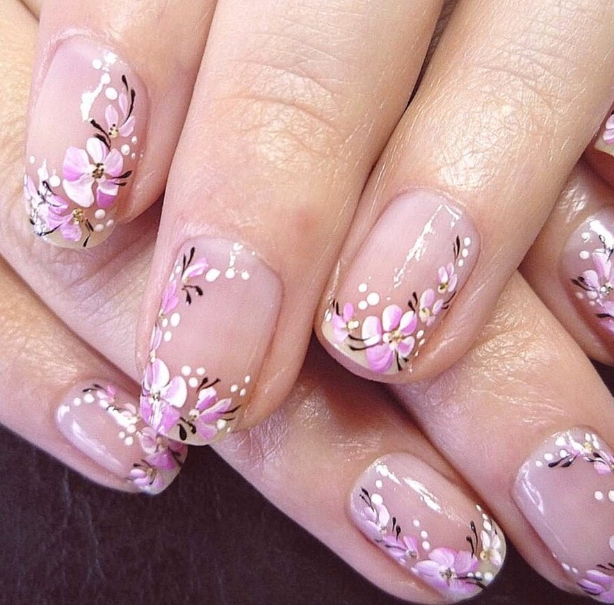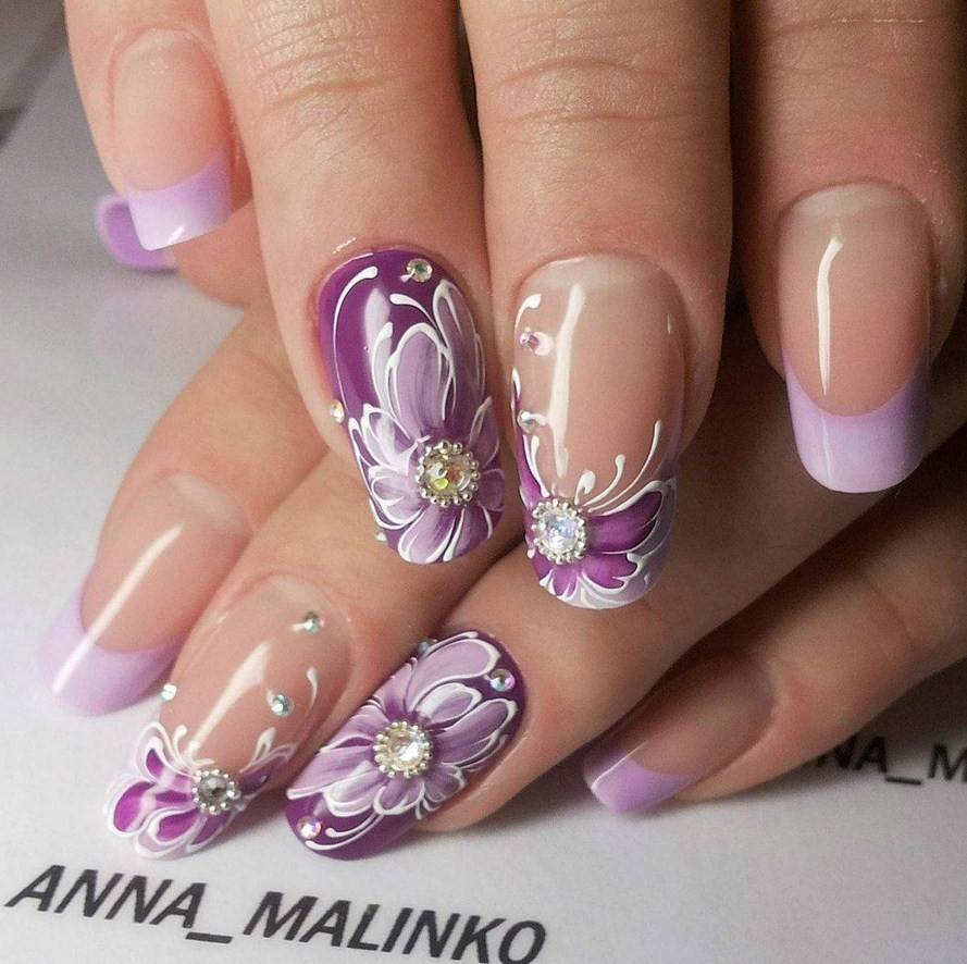 - романтический светло-фиолетовый нейл-арт с различными узорами, в том числе флористическими;