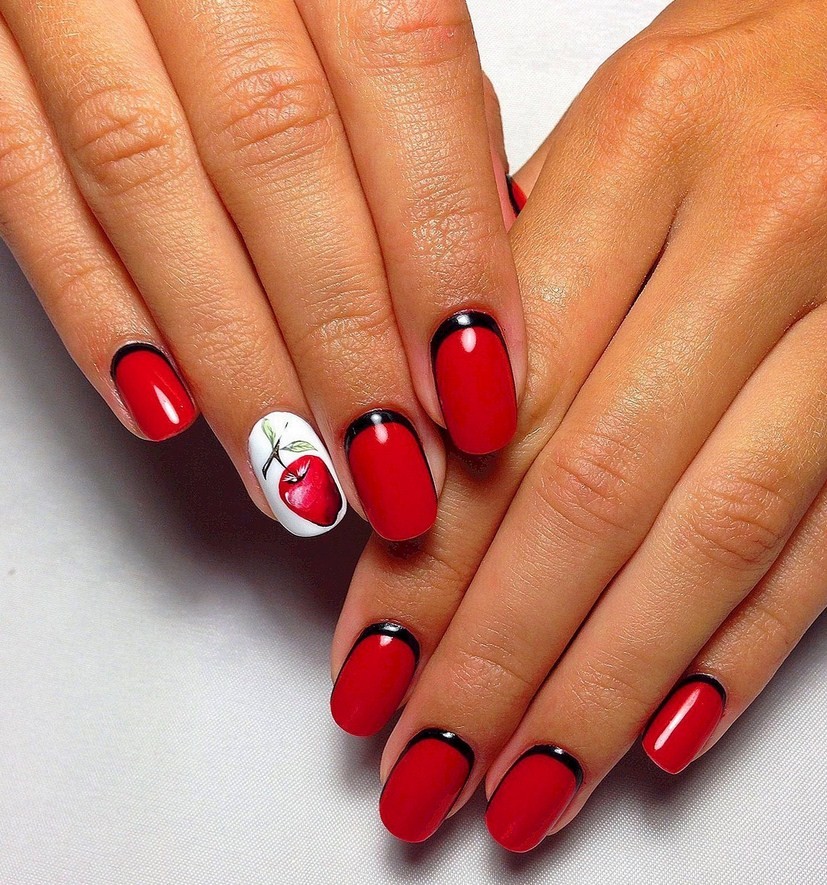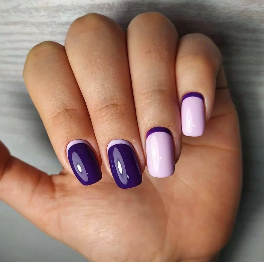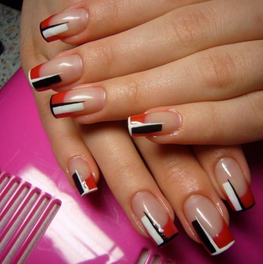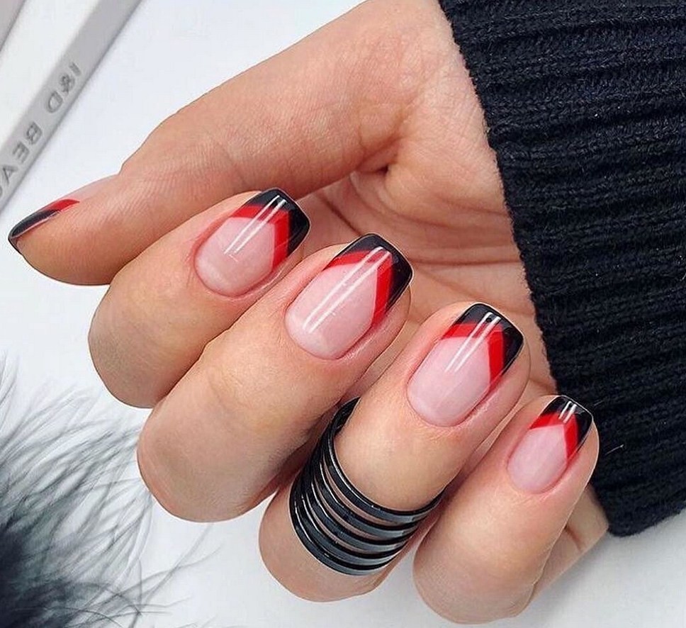 Контрастность отлично сочетается с французским дизайном. Красные ноготки и чёрный краешек? А почему нет? Даже очень красиво! А комбинации фиолетового с бежевым, серого с розовым или жёлтого с зелёным тоже будут выигрышными.