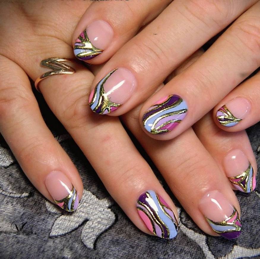 Такой маникюр выглядит как растяжка цвета, которая расплывается цветными полосками. Дизайн прекрасно подходит на длинные и средние по ногти.