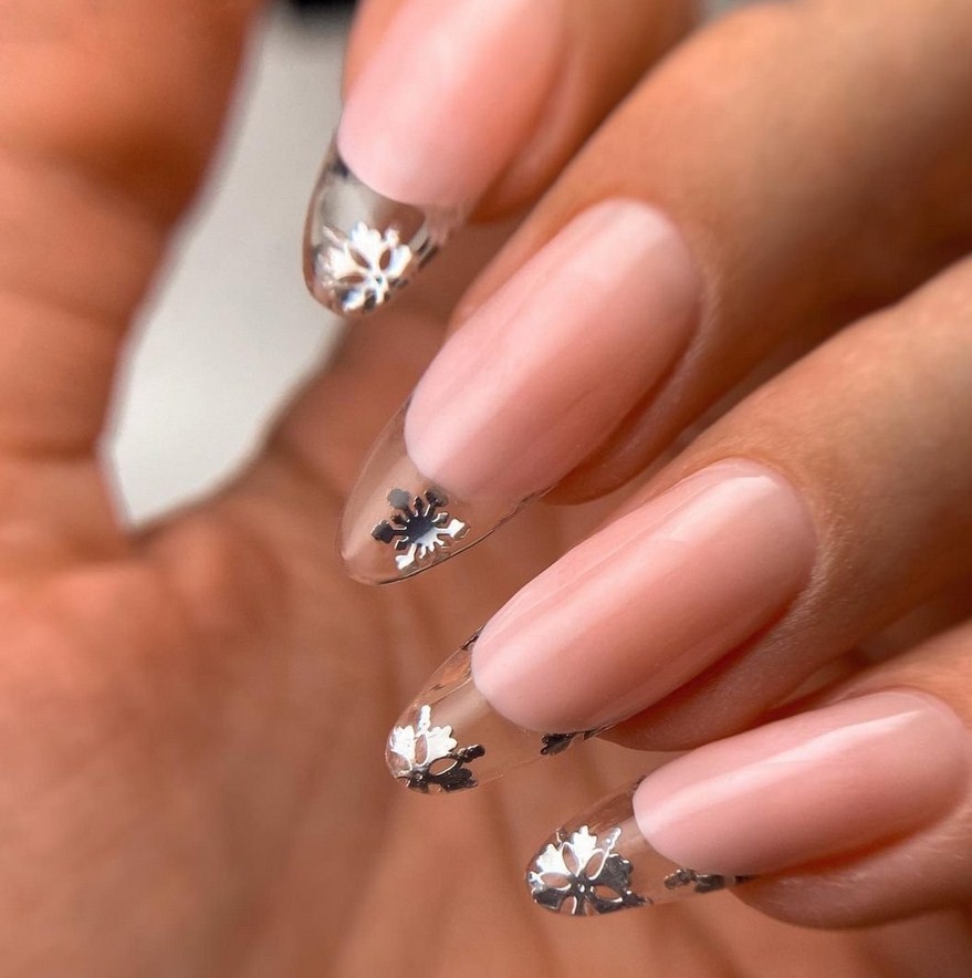 Не стоит думать, что новогодний маникюр предполагает обилие блеска, расписных картин и буйство красок. Этот дизайн можно вполне выполнить на небольшую длину пластины и в светлых тонах. Чтобы ногти не были скучны, его дополняют росписью, добавляют блеск или стразы, все по желанию клиента.