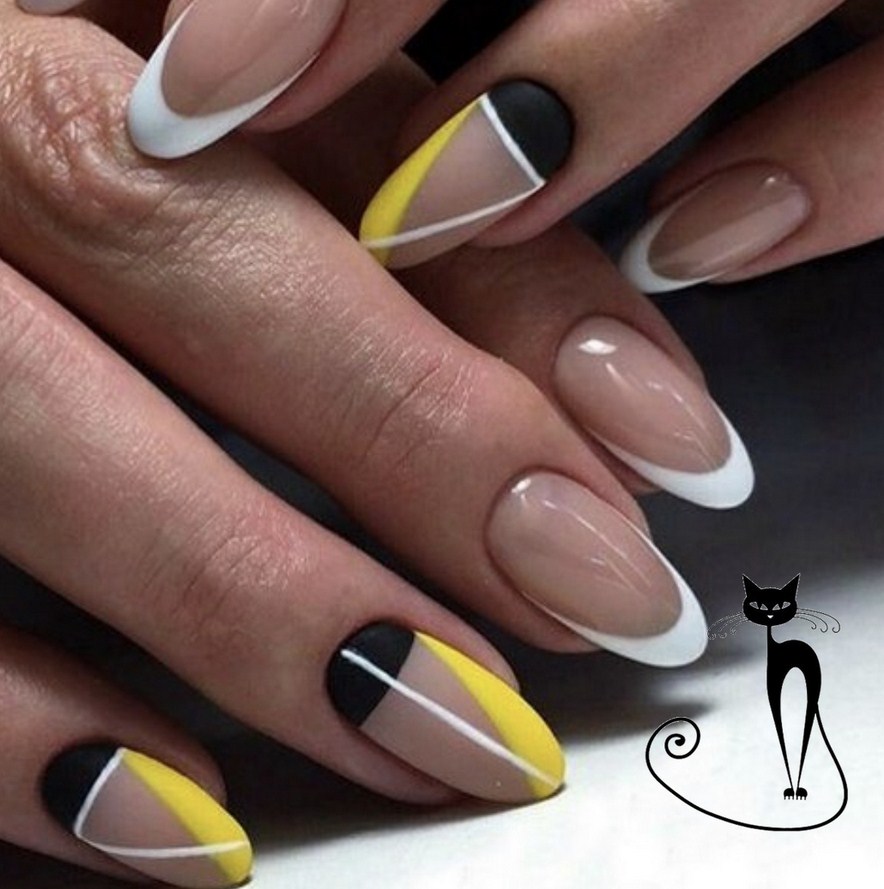 - треугольный френч — вариант маникюра, при котором линия френча образует угол параллельно острию ногтя;