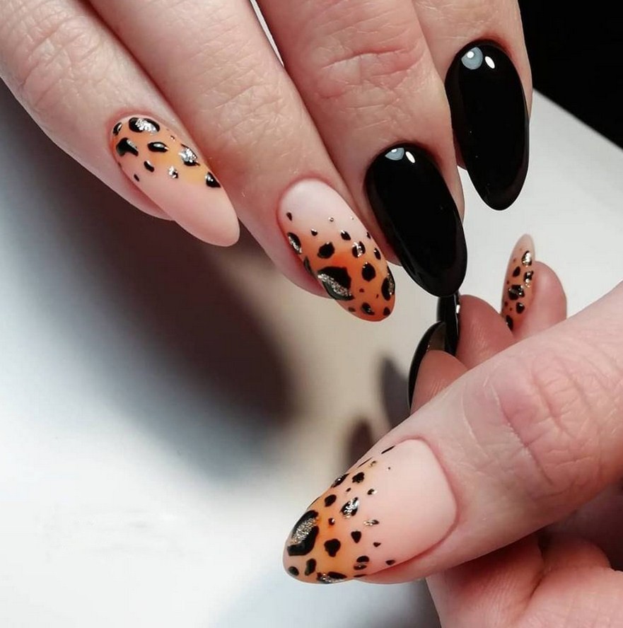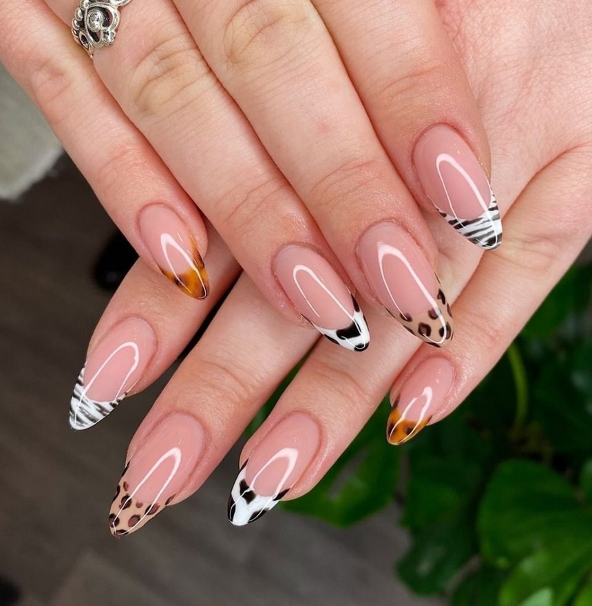 Один из ноготков на каждой руке с классическим или ярким французским дизайном можно сделать акцентным с помощью анималистического принта – изображения шкуры змеи, тигра, леопарда.