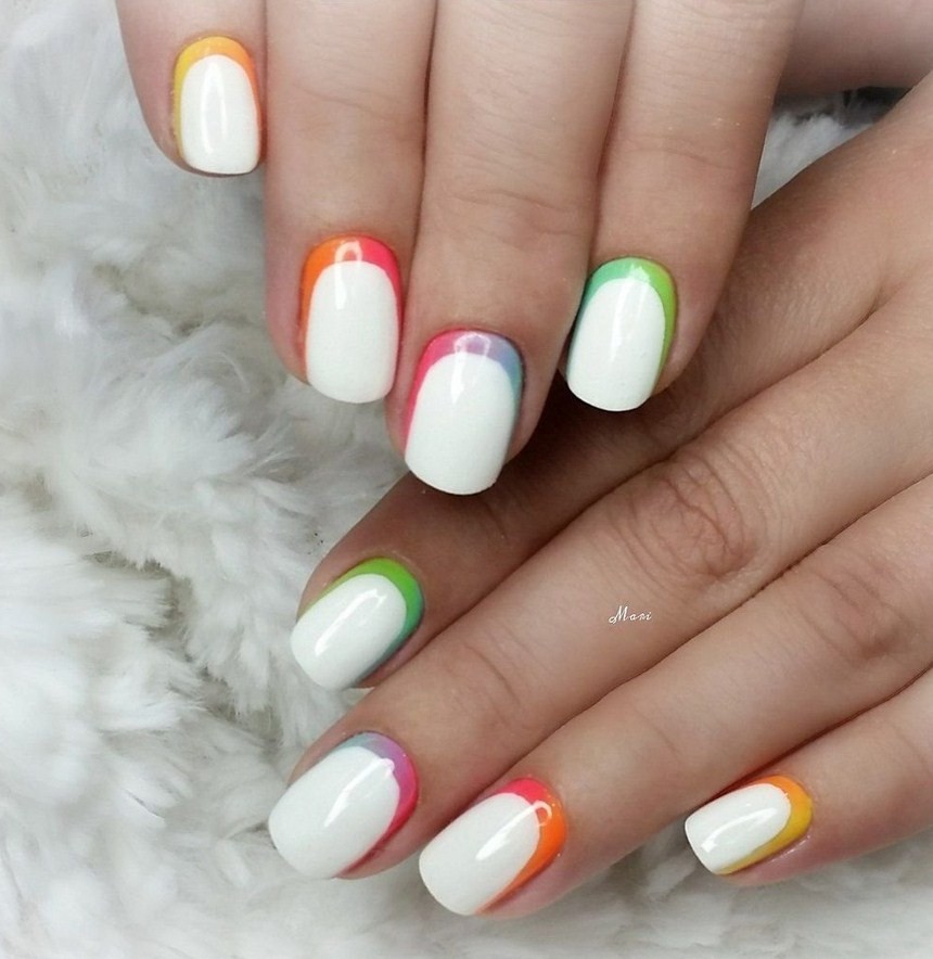 Как выглядит френч, в котором линия улыбки выполнена двумя оттенками? Его можно смело назвать дерзким и неизбитым вариантом классического дизайна. Лучше брать контрастные тона, например, любой яркий и пастельный или белый и неоновый.
