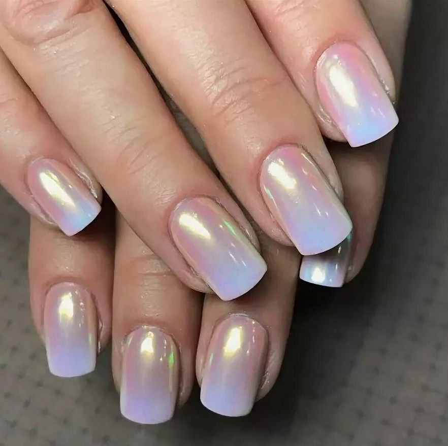 Модный светлый маникюр с жемчужной втиркой уже несколько сезонов остается популярным. Прелестный и очень нежный вариант светлых тонов с переливом придется по вкусу многим.