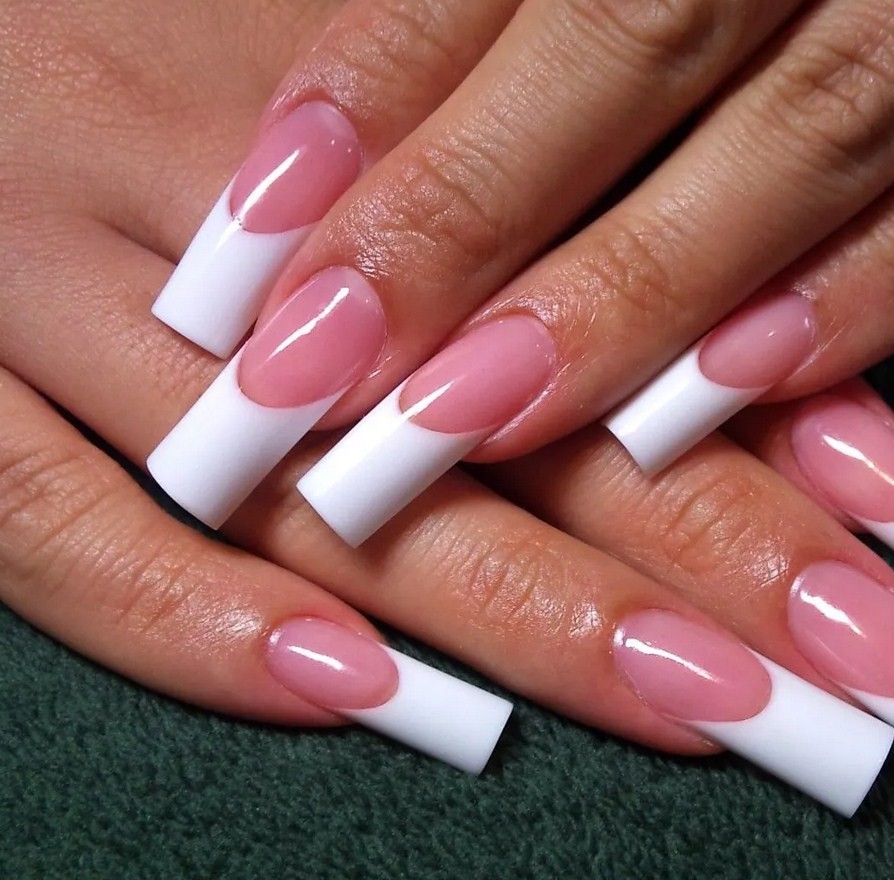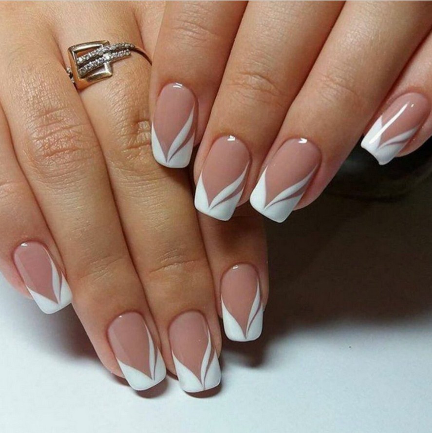 Самый нежный французский маникюр получается при использовании классической комбинации оттенков – белого с телесным или светло-розовым. Стильные белые кончики придадут ногтевым пластинам изящность и привлекательность.