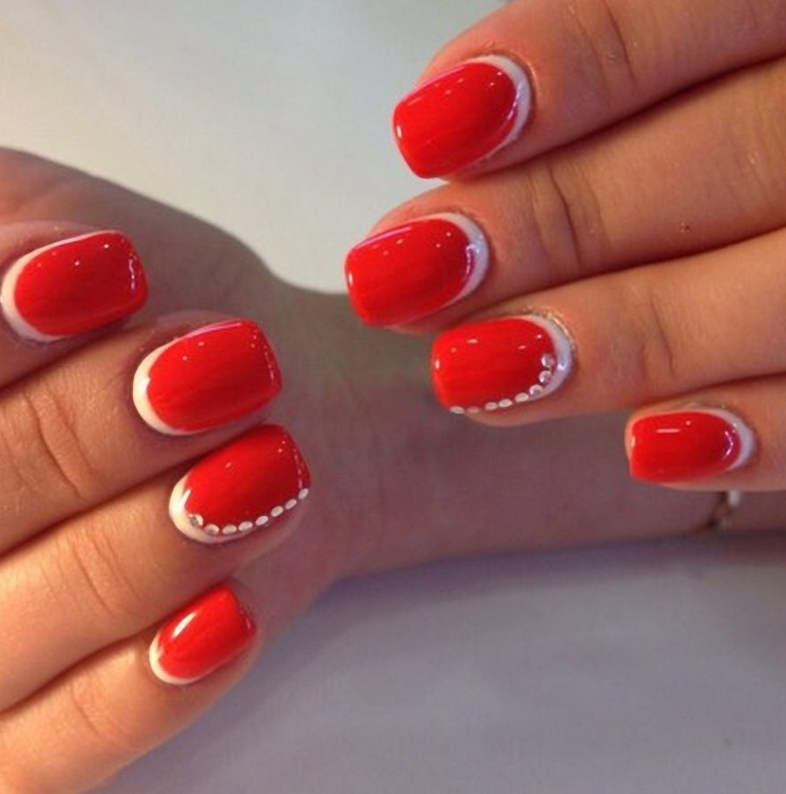 - французский маникюр — неширокая белая полоска по краю ногтя;