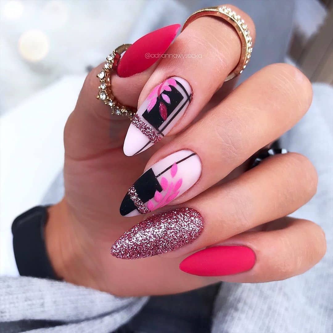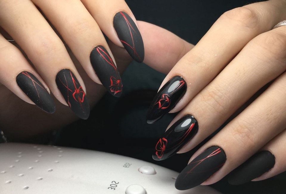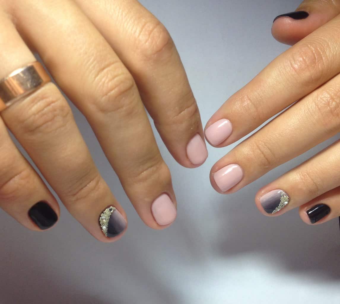 - сочетание негативного пространства, яркого лака черных, бордовых или красных цветов и блесток.
