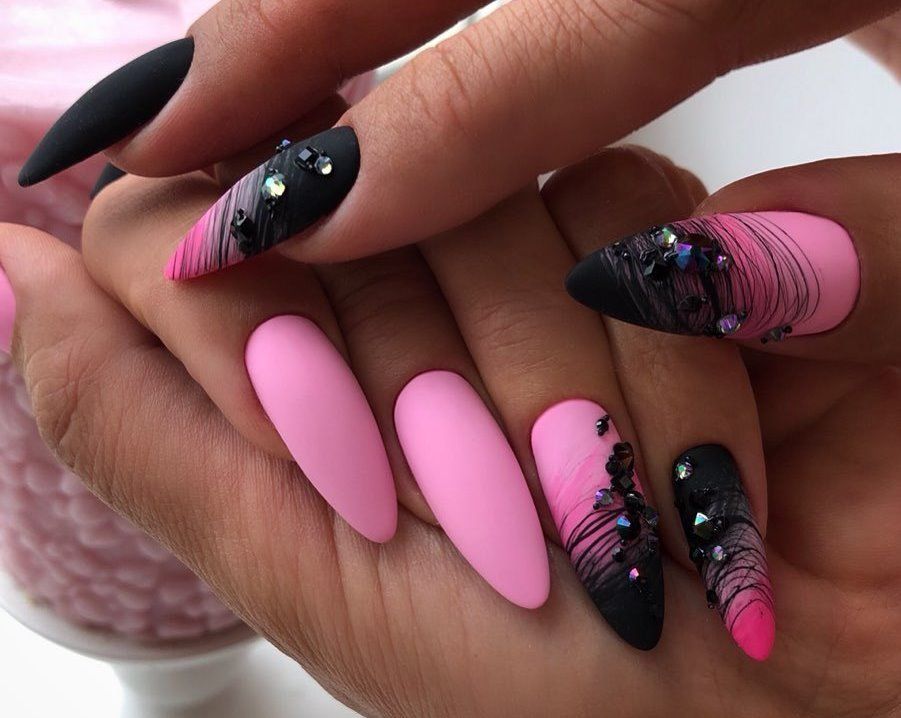 У острых ногтей длинная пластина и заостренный кончик. Одна из наиболее удачных форм для дизайна. Выигрышно будет смотреться любой маникюр. В этом году актуальна классика, нюдовые цвета, френч, для вечернего образа украшение стразами и фольгой.