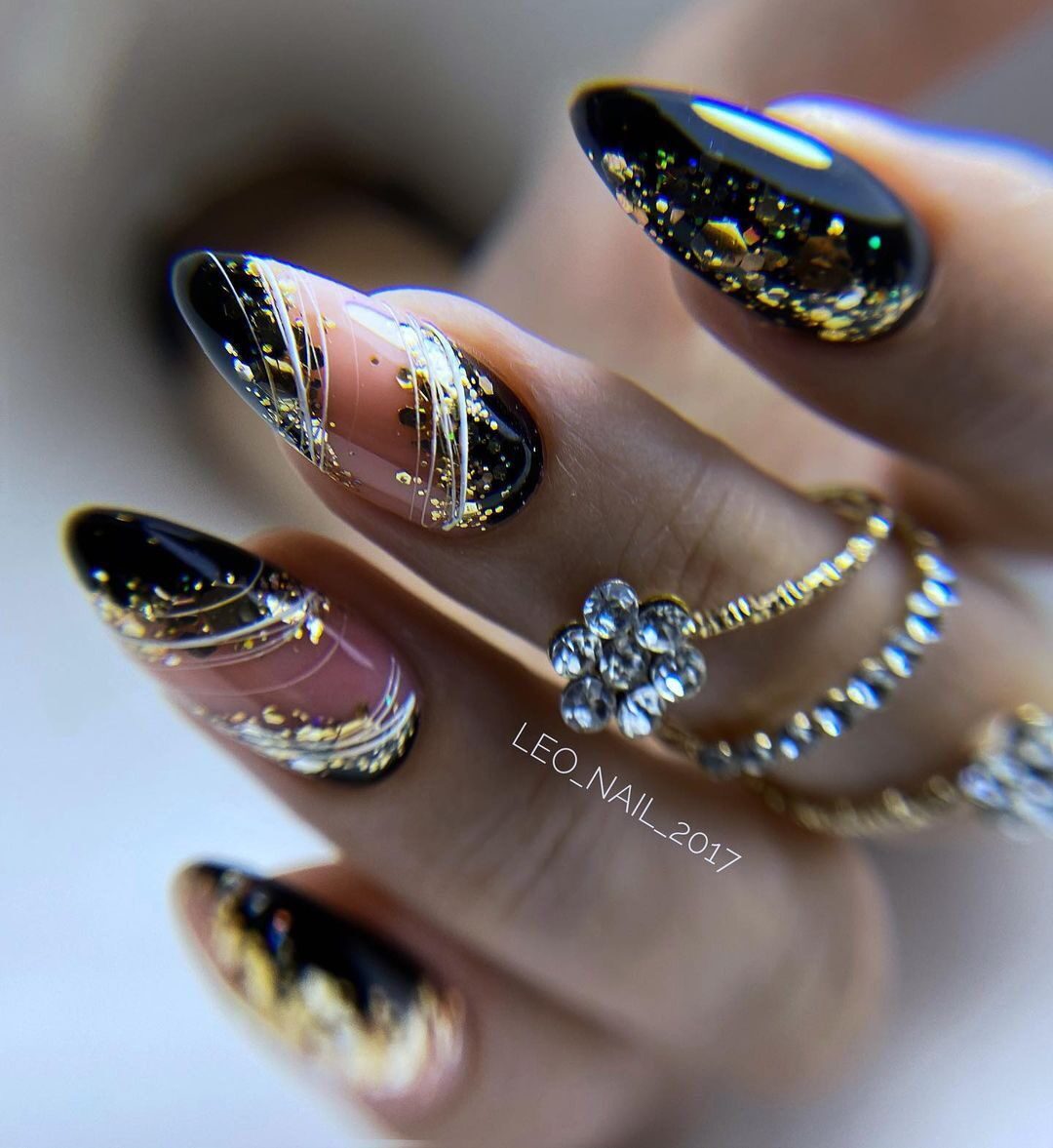 - Гель с хлопьями. В продаже есть уже готовые прозрачные гели для дизайна с черными хлопьями. Просто нанесите гель на базовое покрытие, равномерно распределяя хлопья кисточкой. Такой дизайн смотрится максимально реалистично.