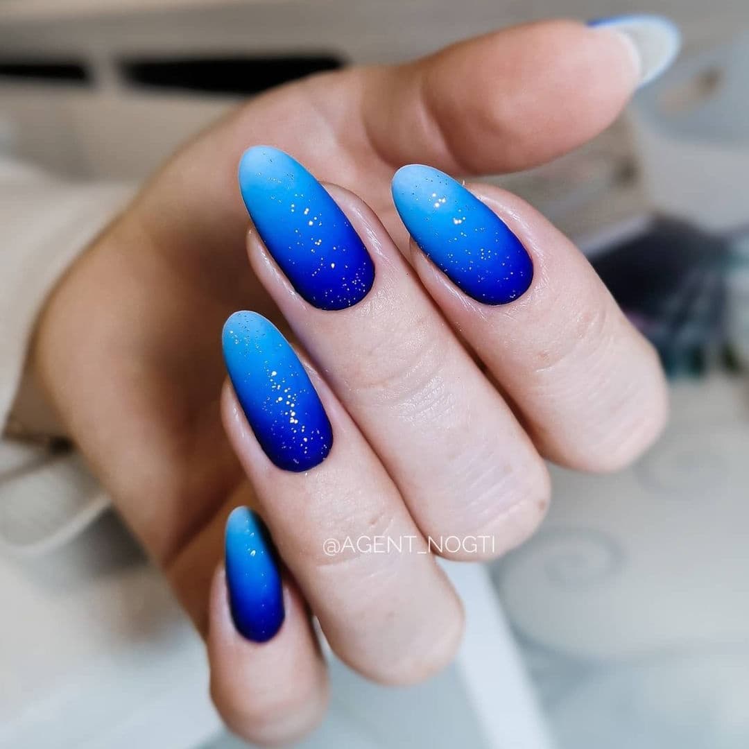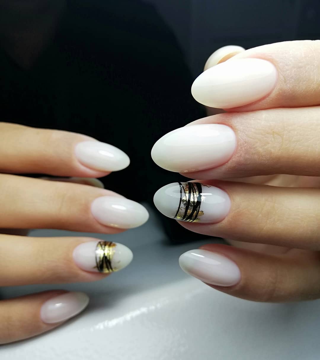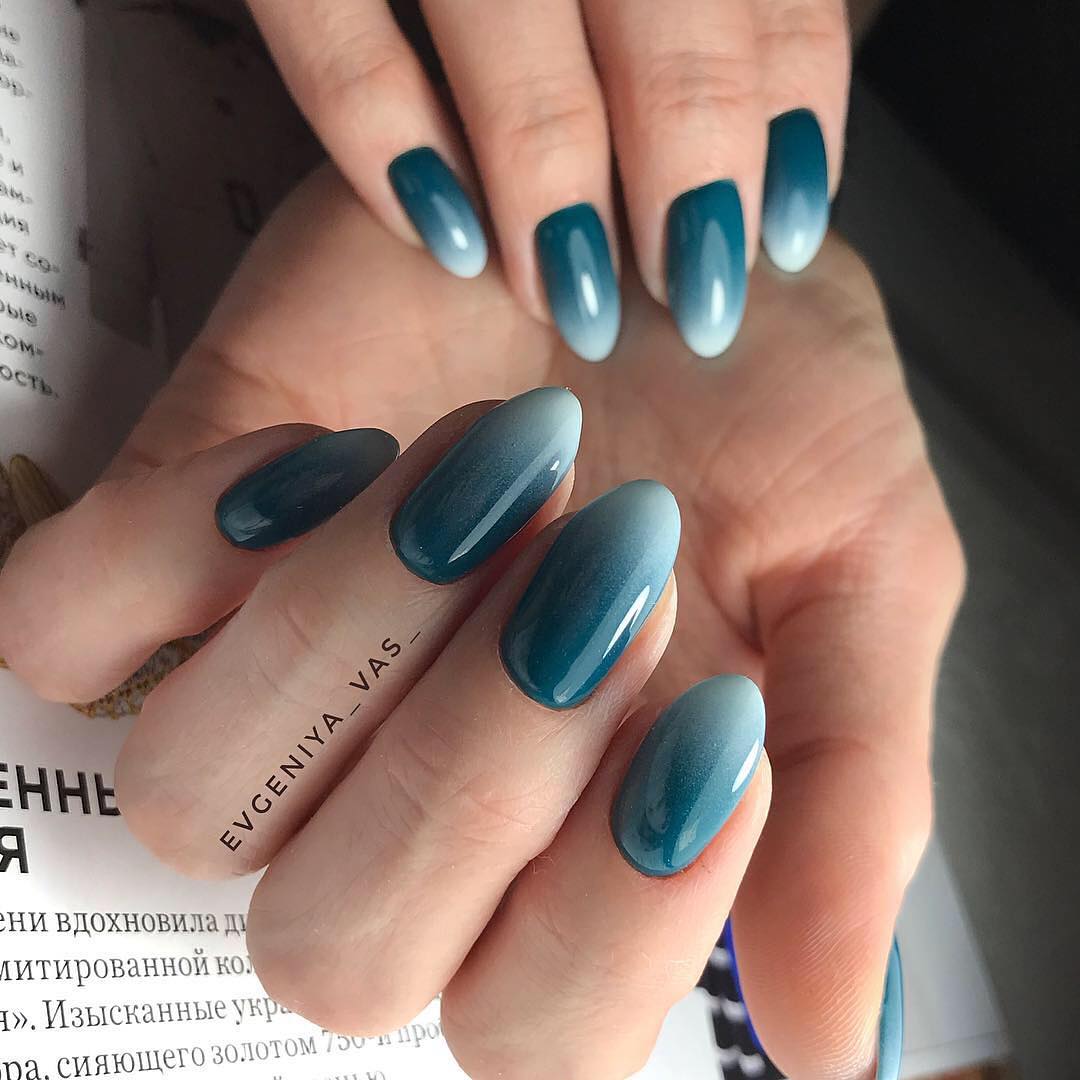 Техника привлекательно смотрится в матовом и глянцевом исполнении, красиво совмещается с шимером и светоотражающими блестками. Кроме того, поверх омбре-растяжки можно изображать геометрические фигуры посредством прорисовки или в техники литья. Также подойдет узор «перепелиное яйцо», растительный принт, пузырьковая техника.