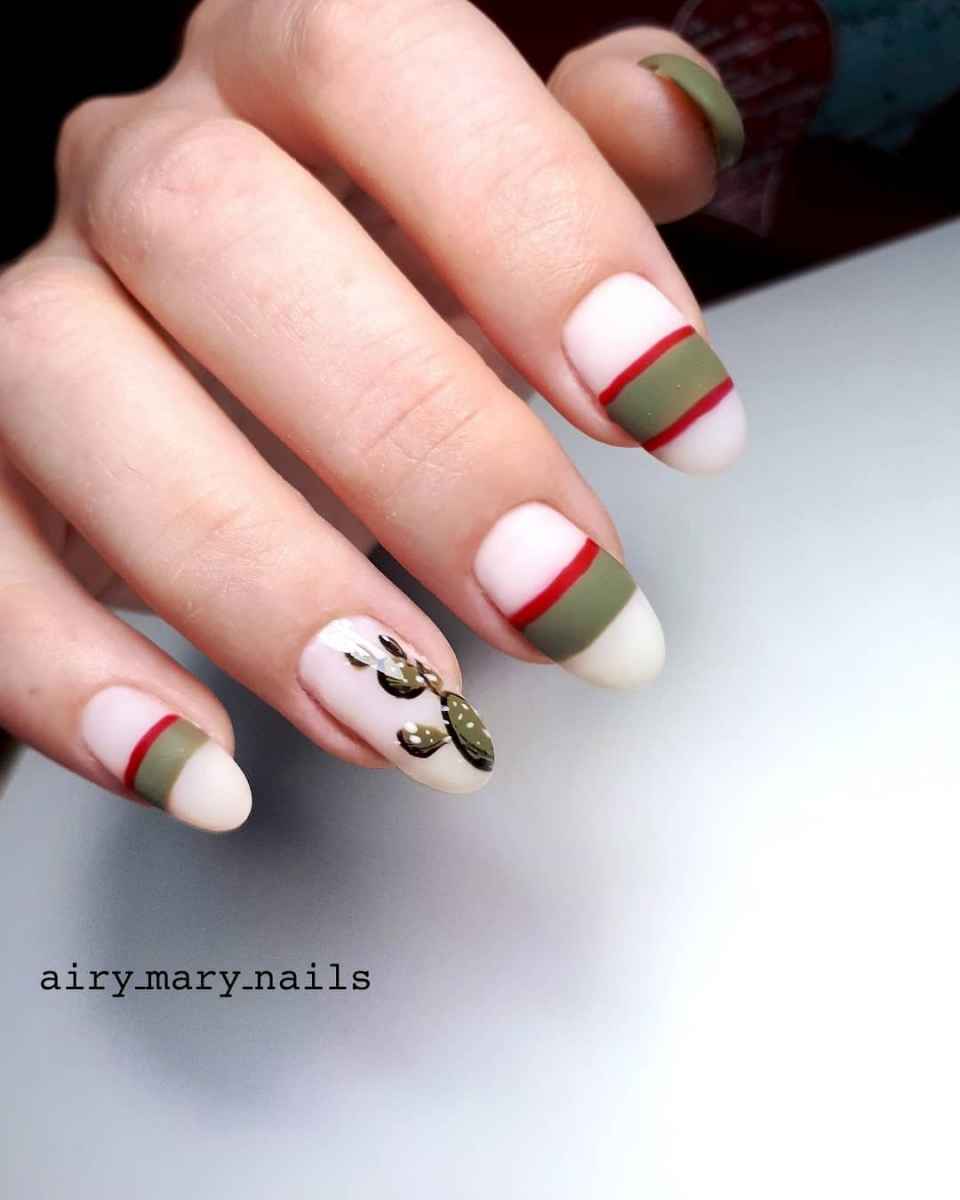 Изумрудный, хаки, нефритовый, мятный — все это природные оттенки. Именно они необходимы для флористического дизайна. Просто нарисуйте листья растений выбранным лаком или нанесите их с помощью наклейки на нейтральную базу и маникюр готов.