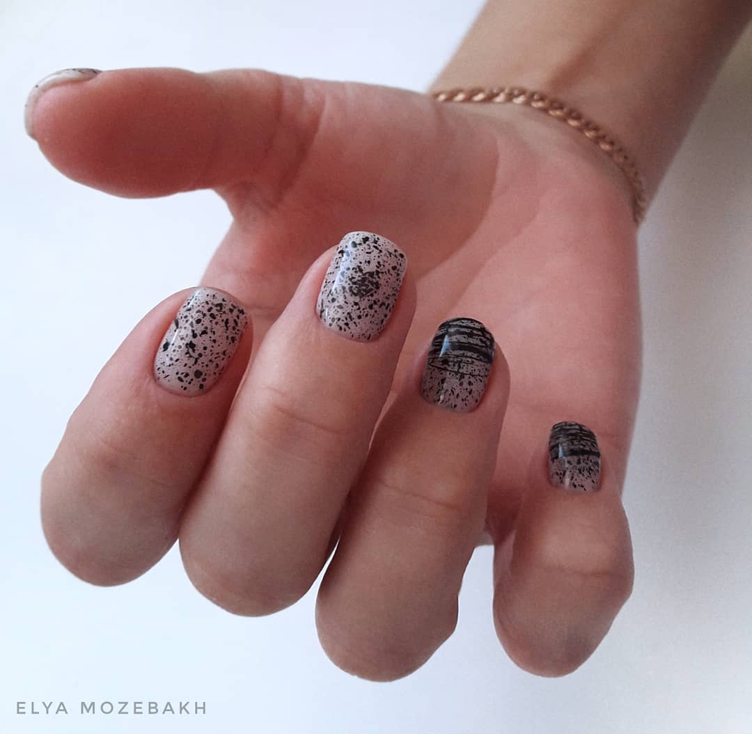 - Брызги. Чтобы пятнышки получились максимально хаотичными, наберите немного черной гель-краски на кисть и брызгайте краской на ноготь, проводя по щетинкам пальцем. Делать это нужно в резиновых перчатках, также стоит защитить кожу вокруг ногтей и поверхность, на которой вы работаете. Если брызги попали на кожу, аккуратно удалите их с помощью специального средства.
