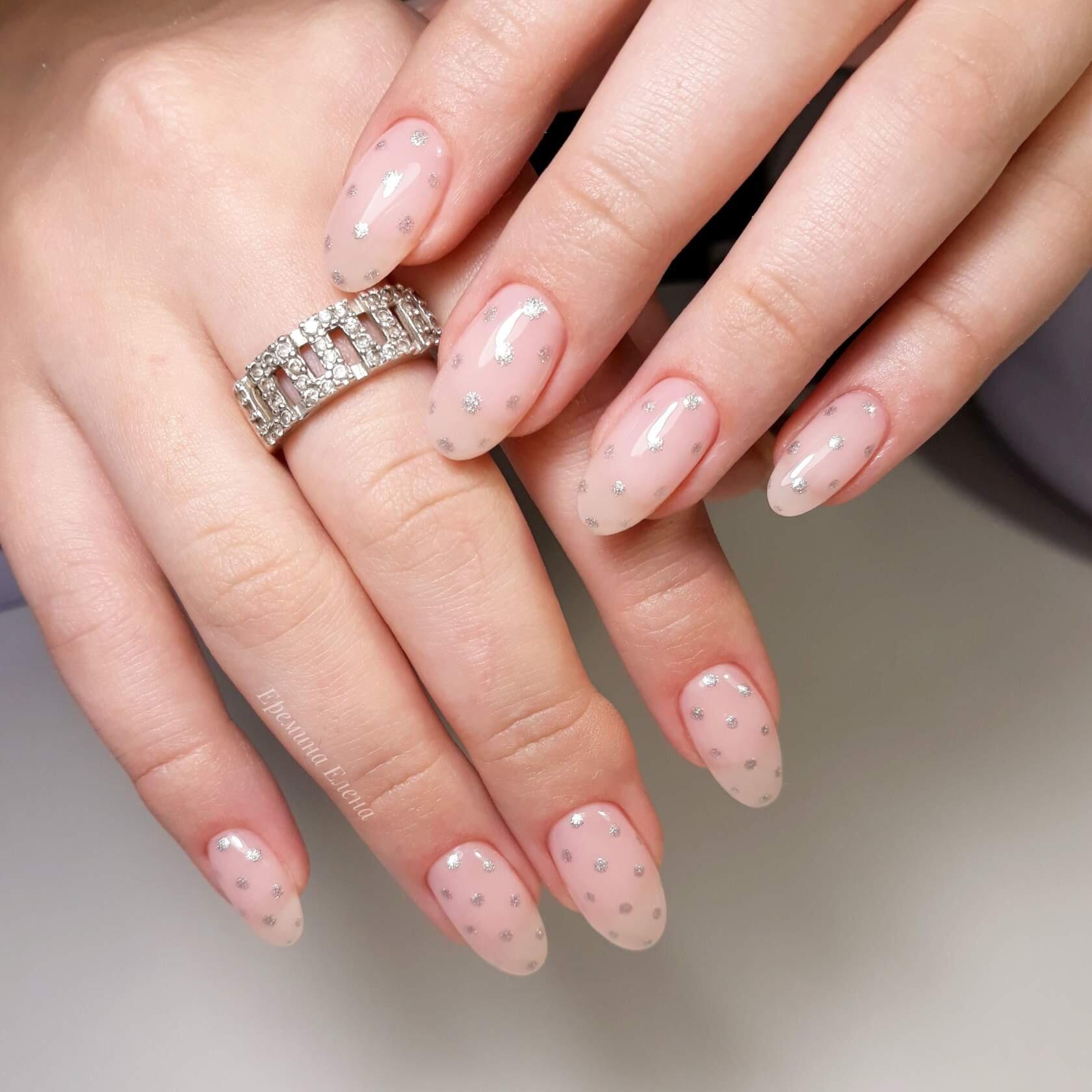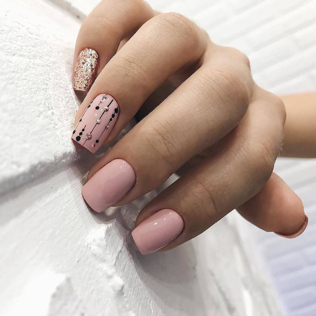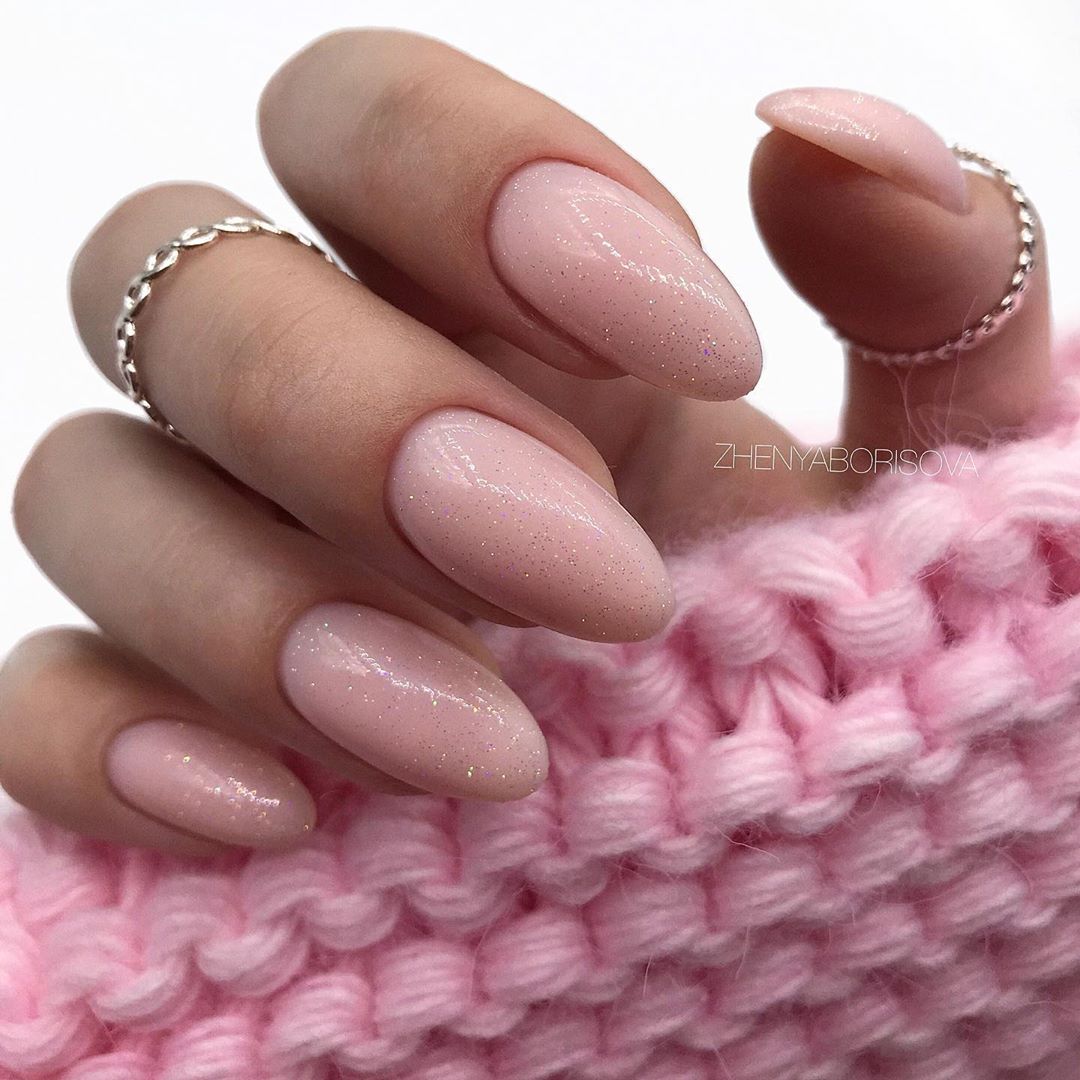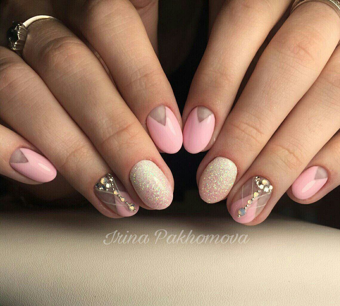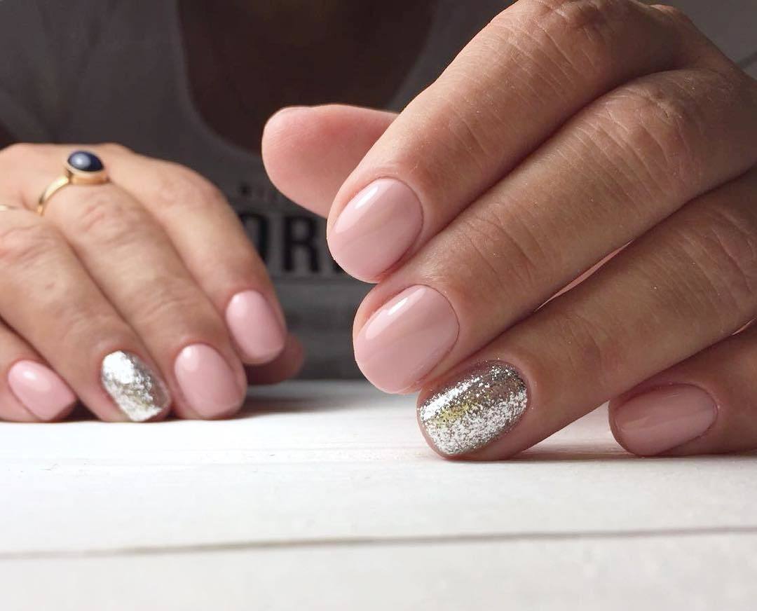 Мягкий, пастельный розовый цвет в нюдовых оттенках отлично смотрится в сочетании с серебристым, золотистым или подходящим по цвету глиттером.