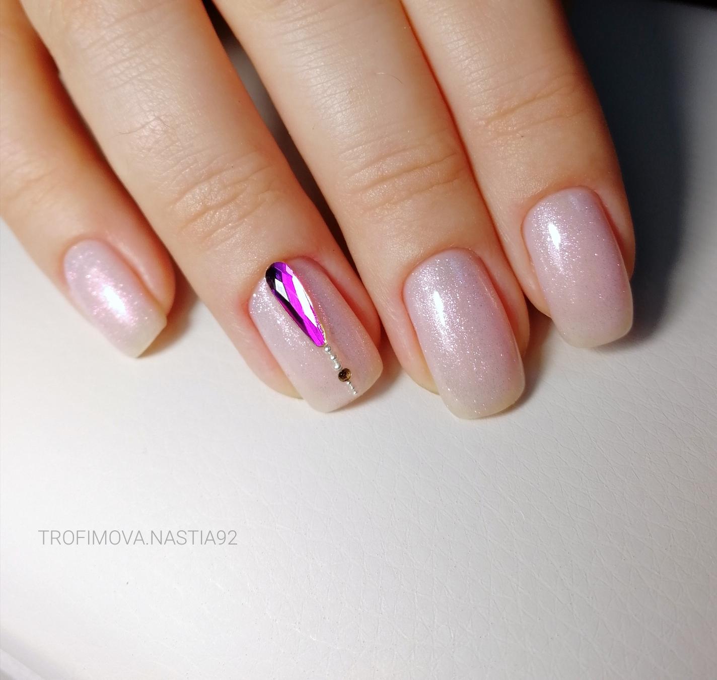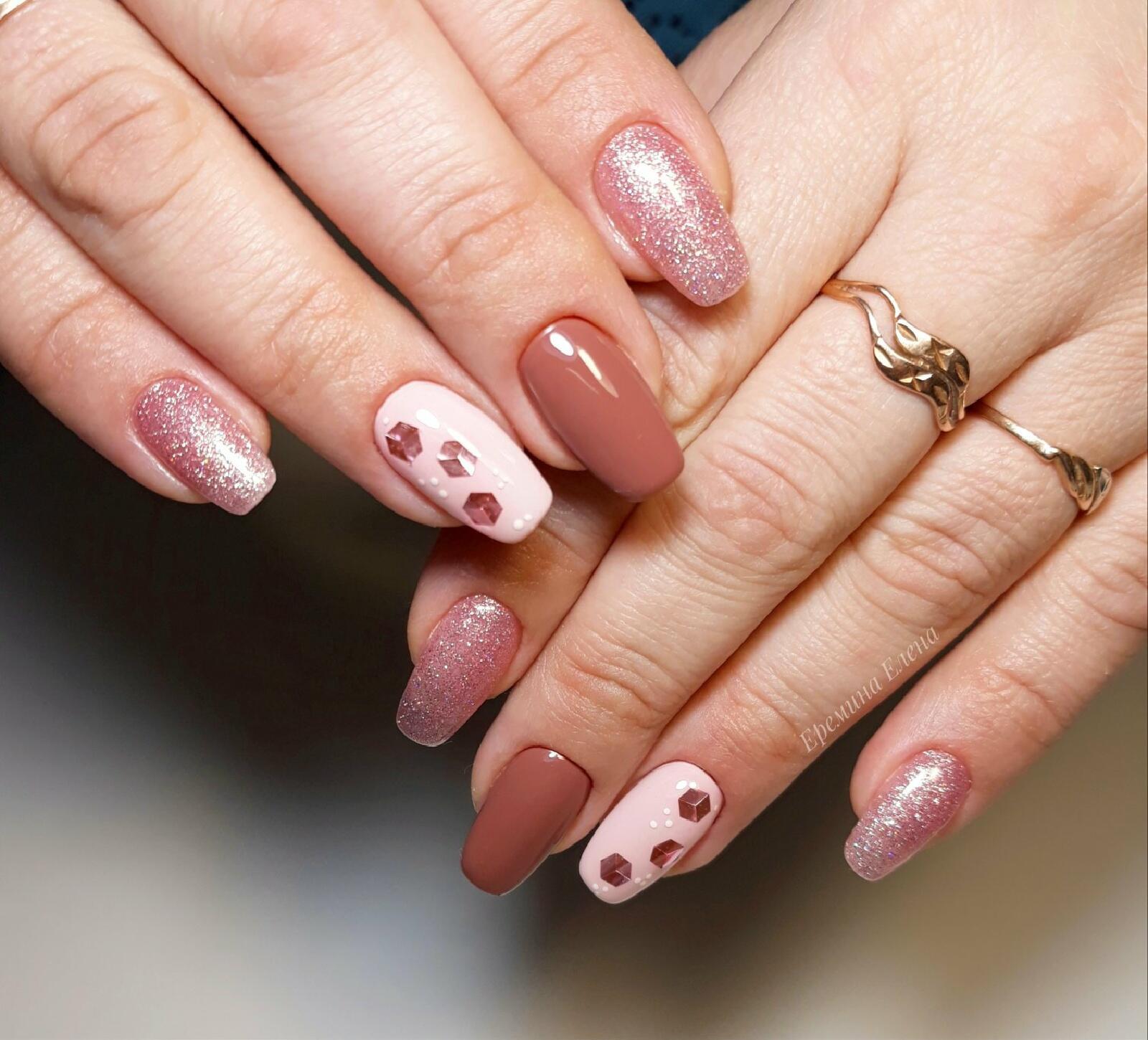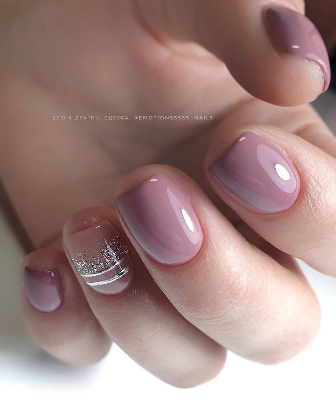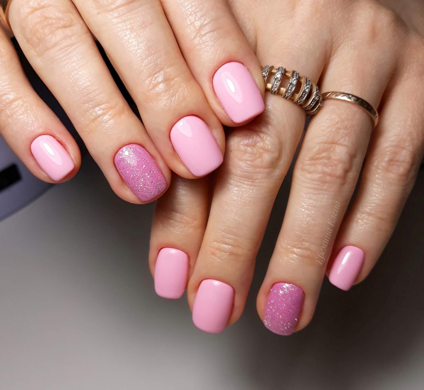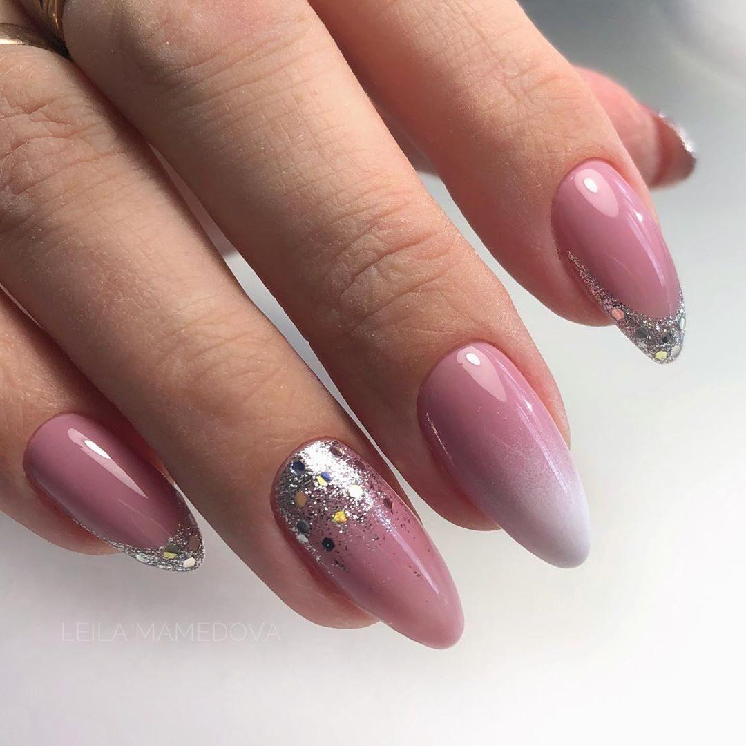 Мягкий, пастельный розовый цвет в нюдовых оттенках отлично смотрится в сочетании с серебристым, золотистым или подходящим по цвету глиттером.