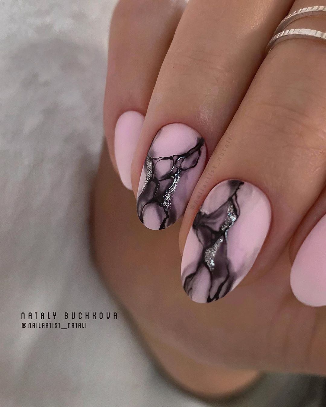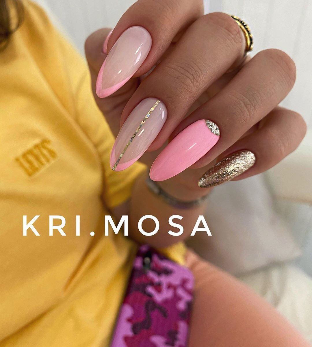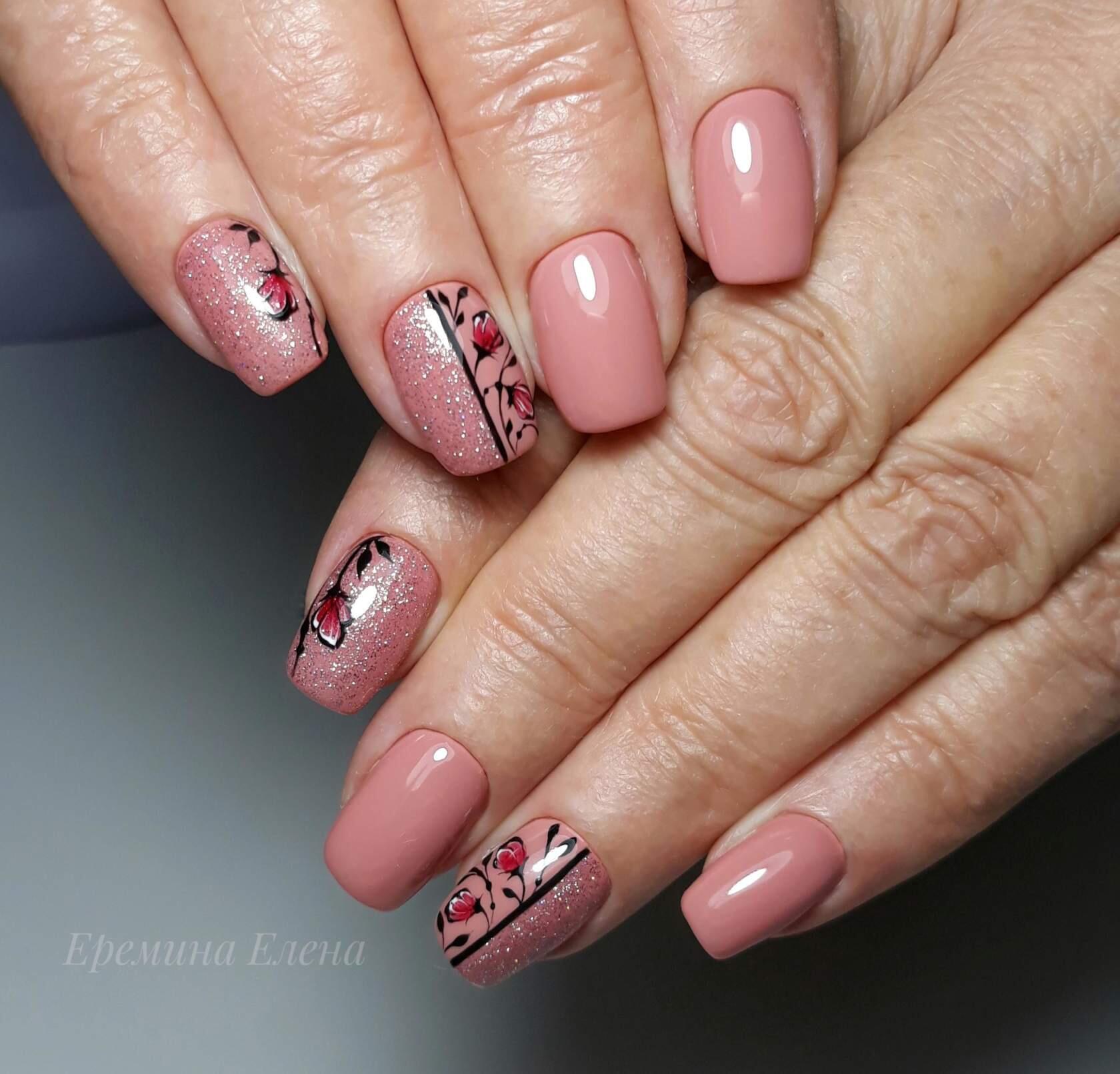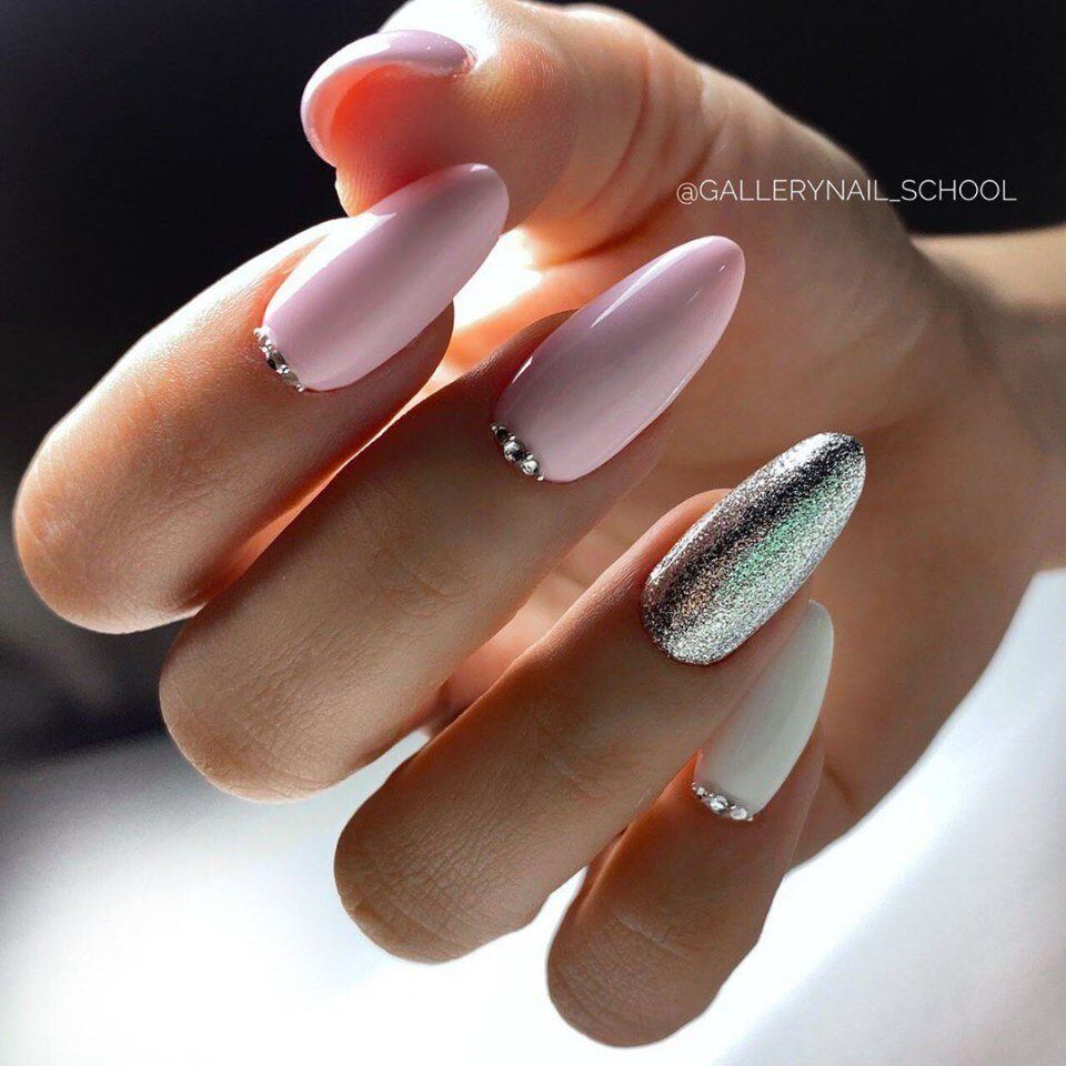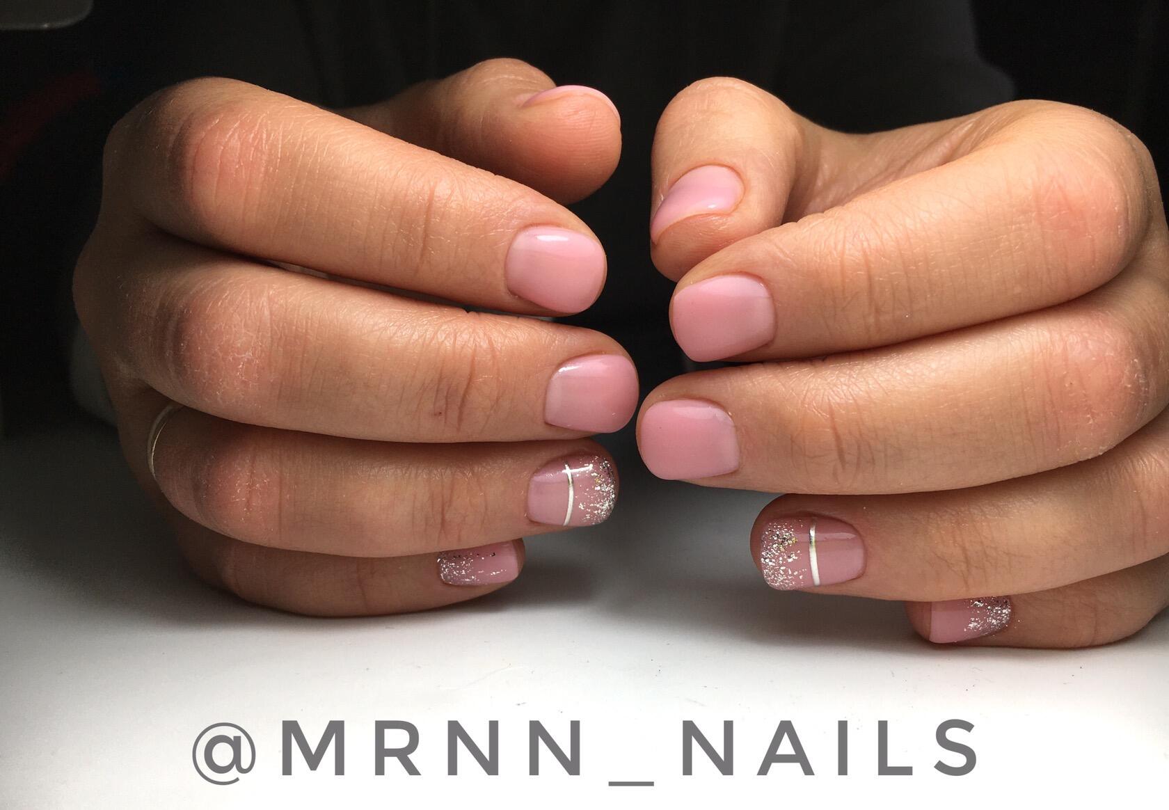Мягкий, пастельный розовый цвет в нюдовых оттенках отлично смотрится в сочетании с серебристым, золотистым или подходящим по цвету глиттером.