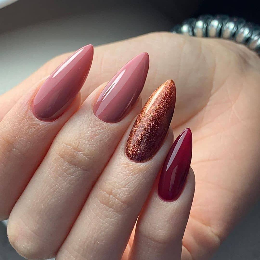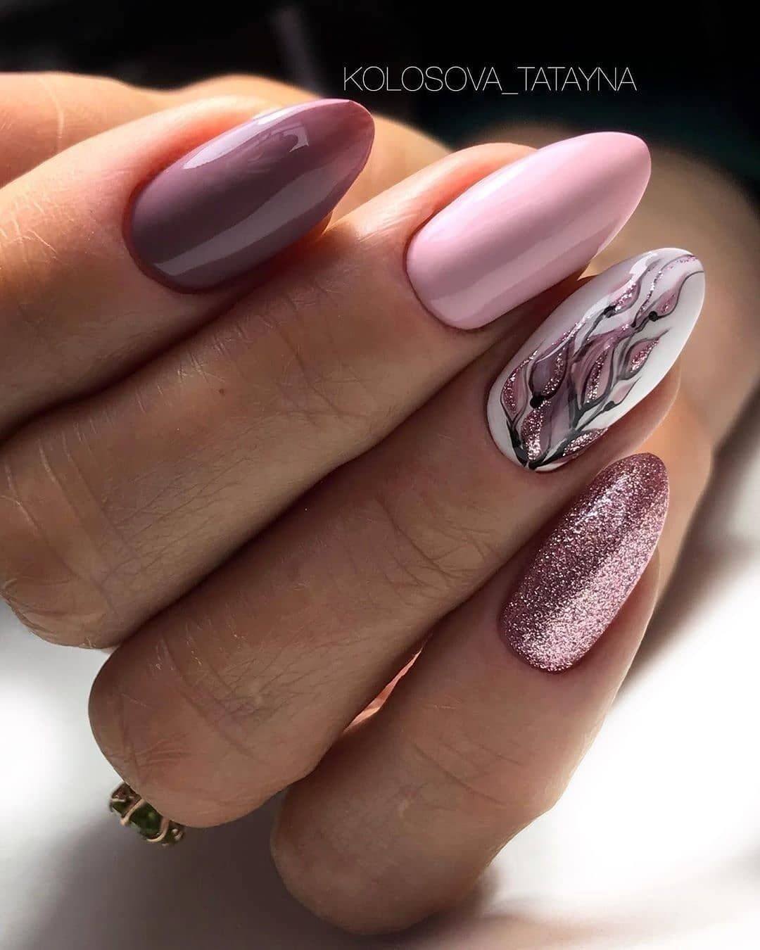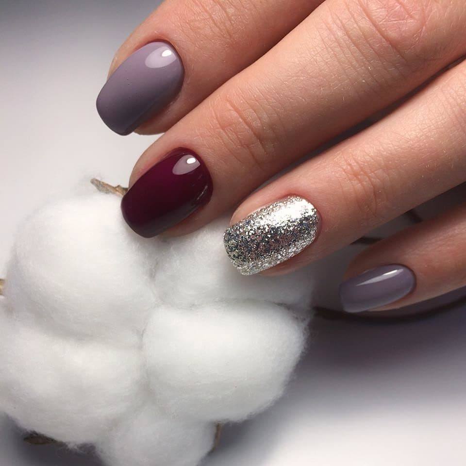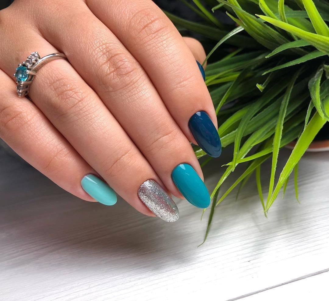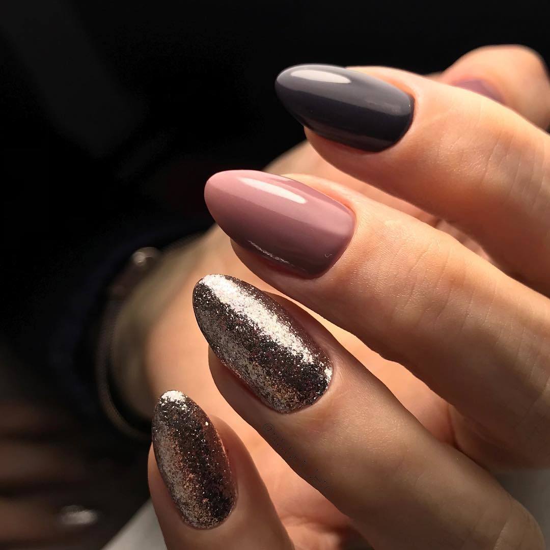 Другим стильным вариантом оформления маникюра может стать сочетания нескольких цветов с использованием блесток. Удачным вариантом считается плавный переход одного цвета, но в разных оттенках по всем пальцам руки. Либо используют 2-3 контрастных цвета. Например: черный и белый, красный, белый и золотой.