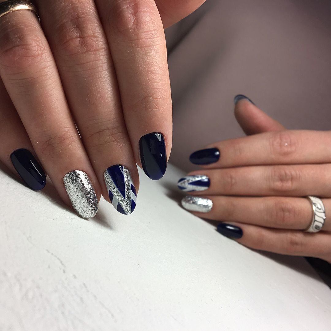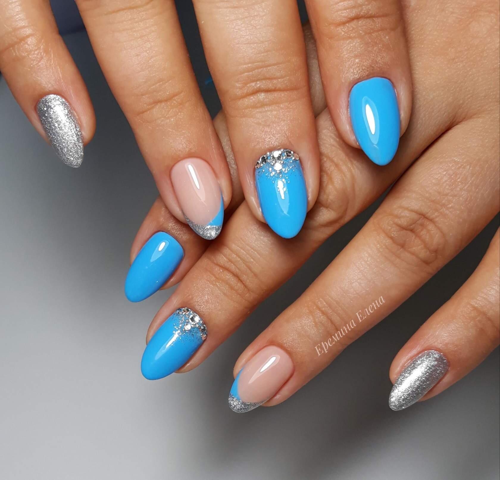 Синий – второй по популярности цвет после красного. Синяя основа может быть гармонично дополнена белыми, серебряными, золотыми, синими и золотыми блестками и их комбинациями. Удачное сочетание синего лака для ногтей с глиттером на коротких или средних ногтях, так как он оптически удлиняет ногтевую пластину. Блестки лучше всего наносить на свободный край или углубление в середине ногтя без четких контуров. Блеск также можно использовать для нанесения художественной абстракции, особенно популярной в этом сезоне. Чтобы не перенасытить композицию, украсьте блестками несколько ногтей на каждой руке, оставив хотя бы две-три пластины одноцветными. Чтобы убрать ненужный блеск и подчеркнуть переход между цветами, поможет последний матовый слой. Матовость подчеркивает глубину синего цвета.