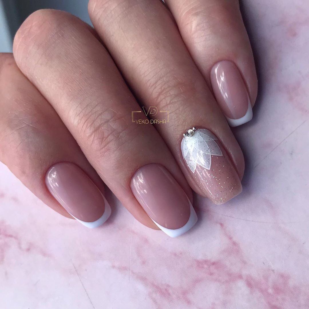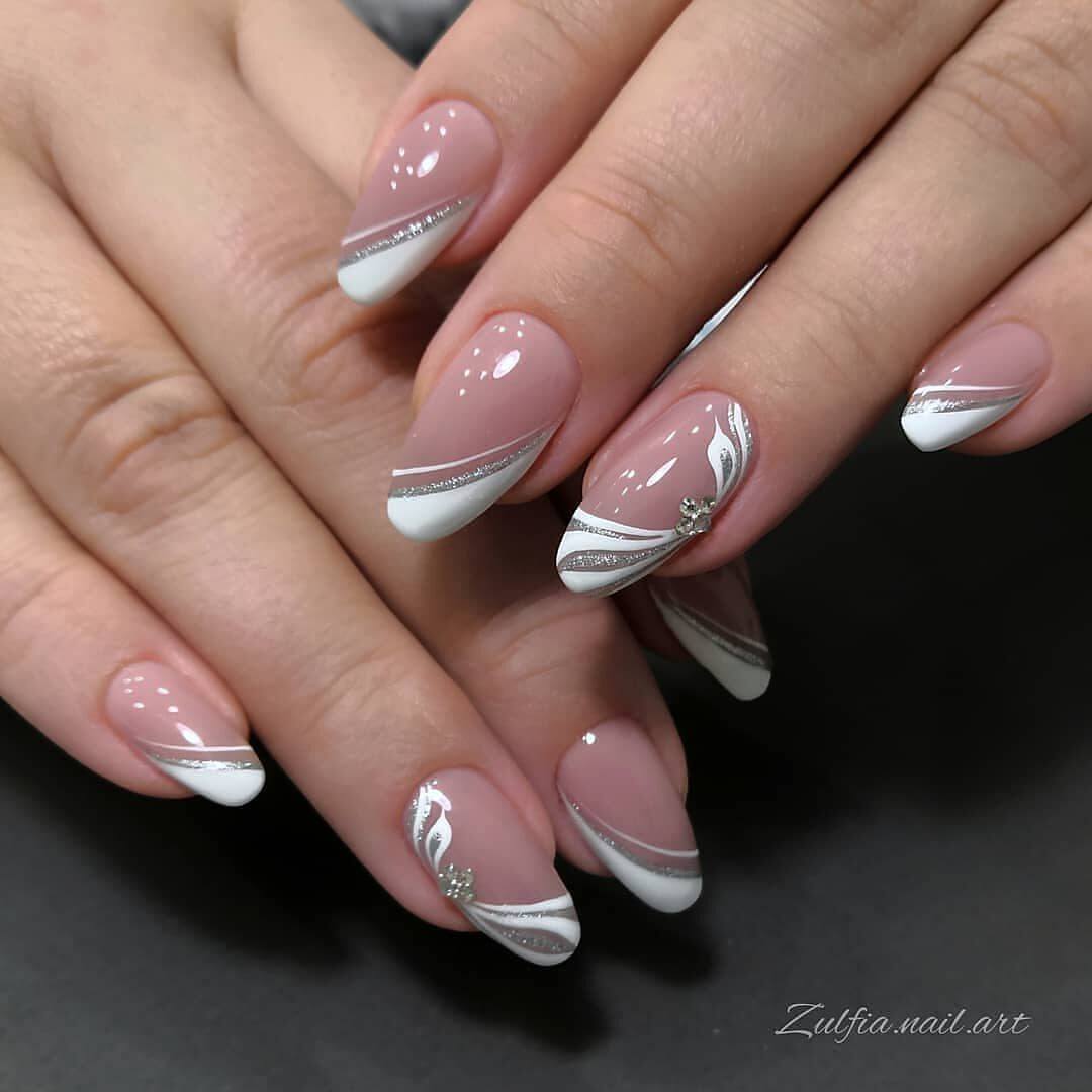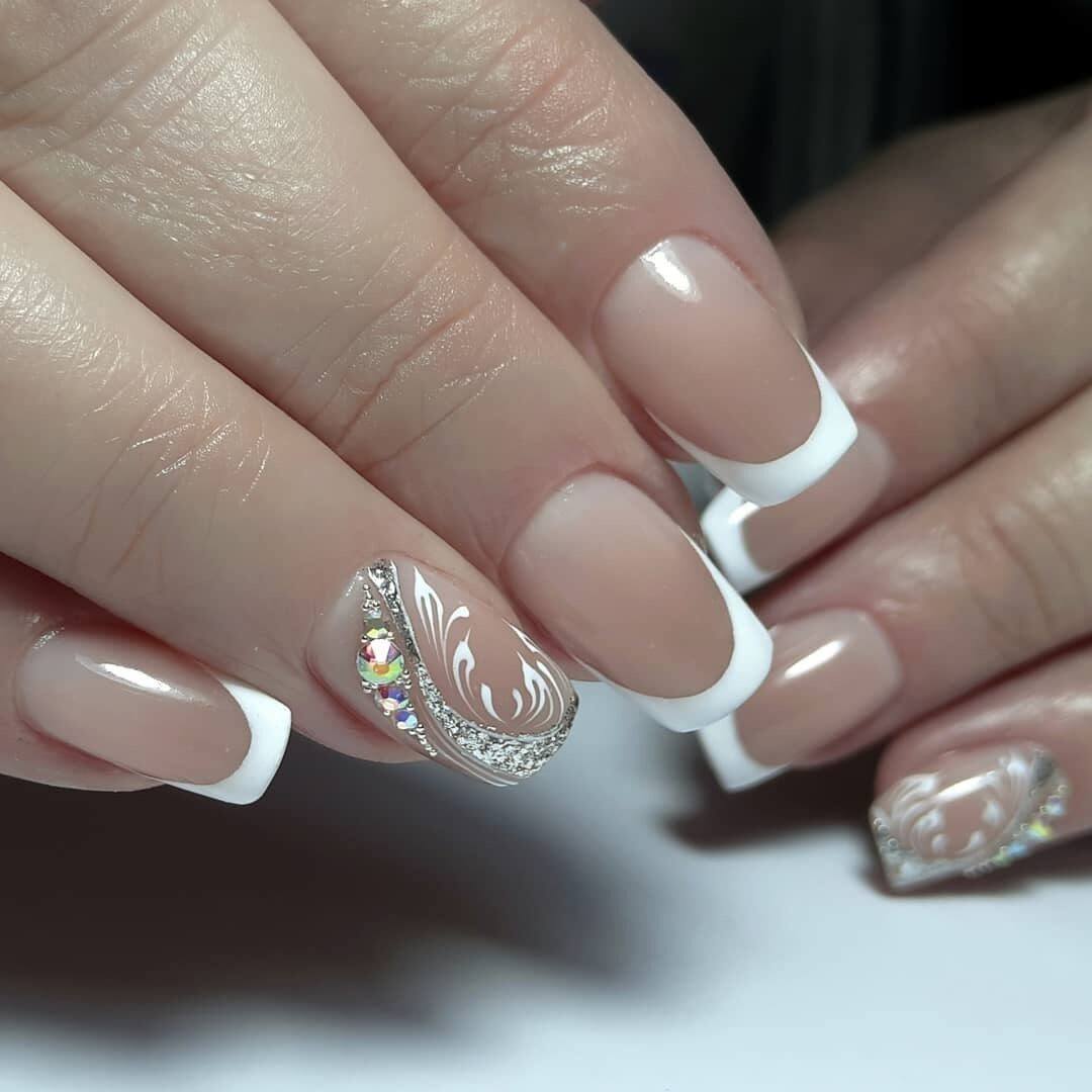 Изящно и нежно смотрится френч в сочетании с вензелями, блестками и стразами.