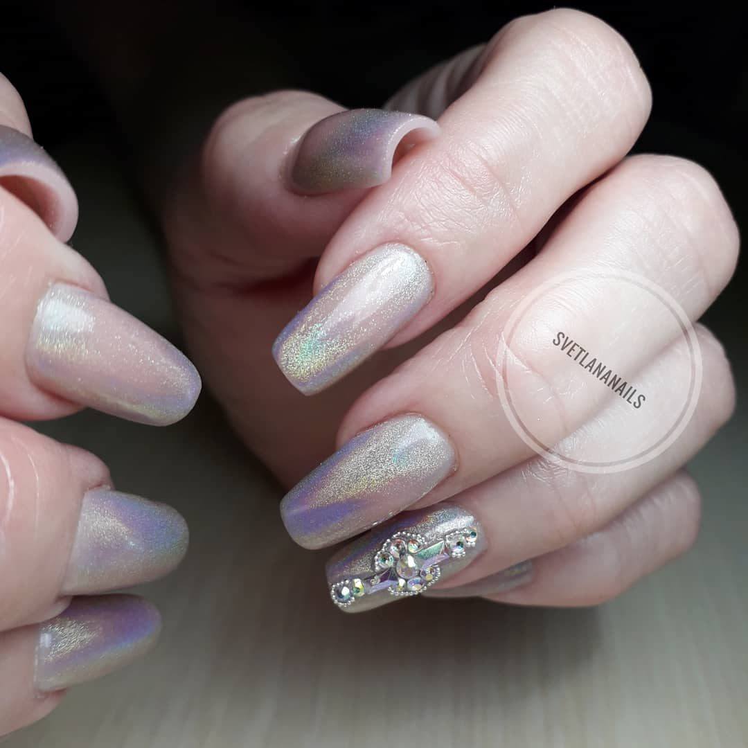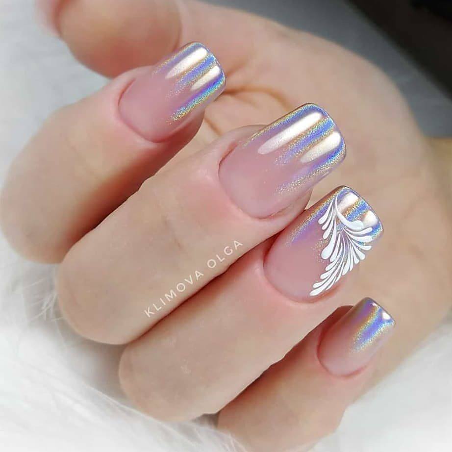 - Осенью особенно красивы ногти с голографическими блестками и омбре.