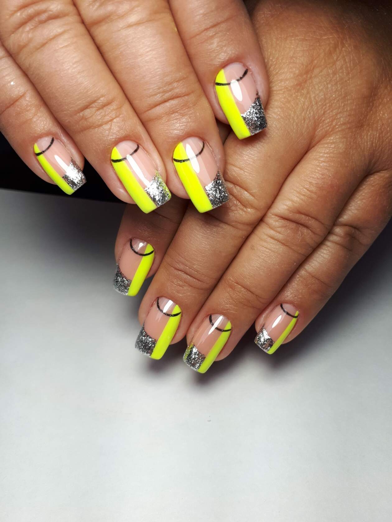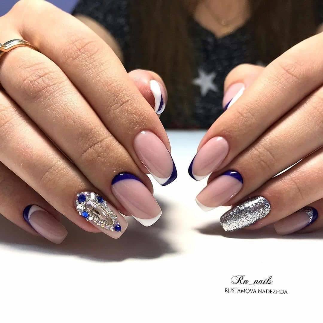 Красиво и стильно будет выглядеть золотой, серебристый, черный, синий, голубой и красный френч в блестящем исполнении, или с добавлением блесток, рисунков и страз.
