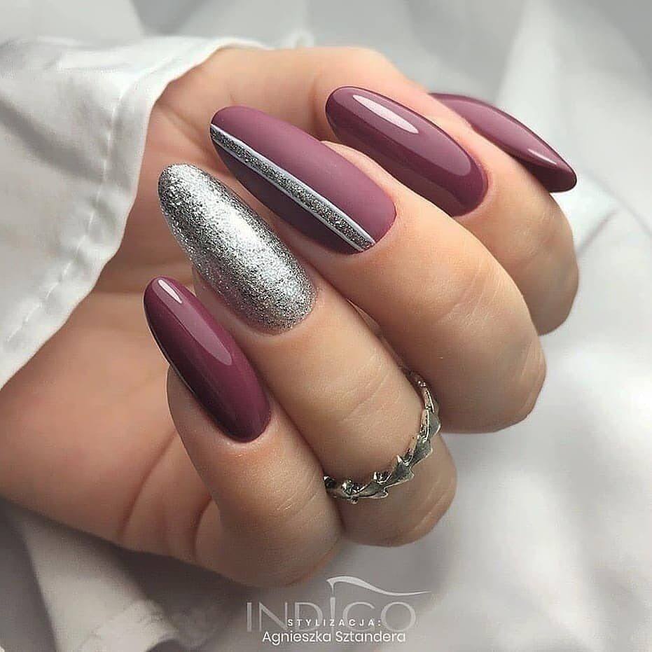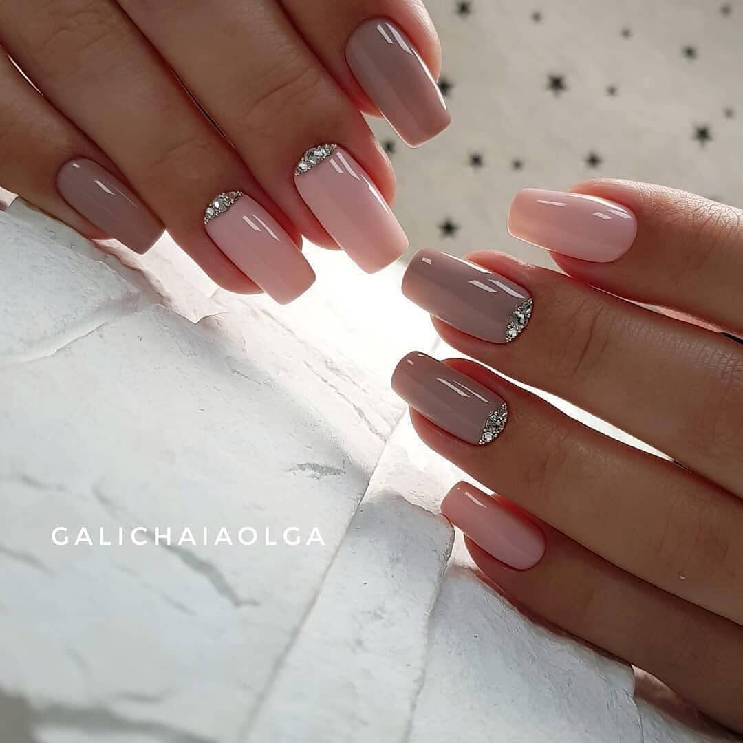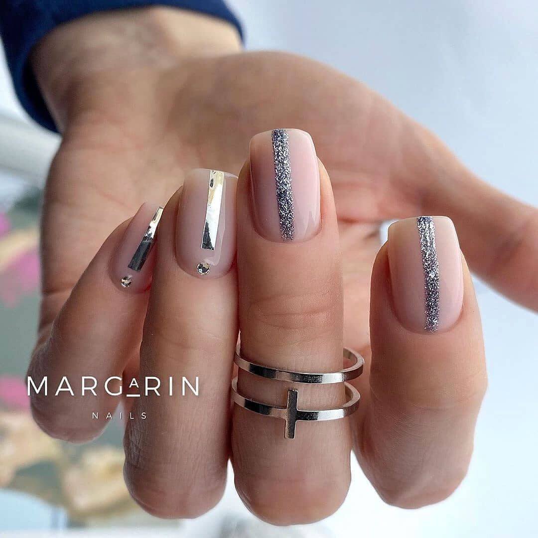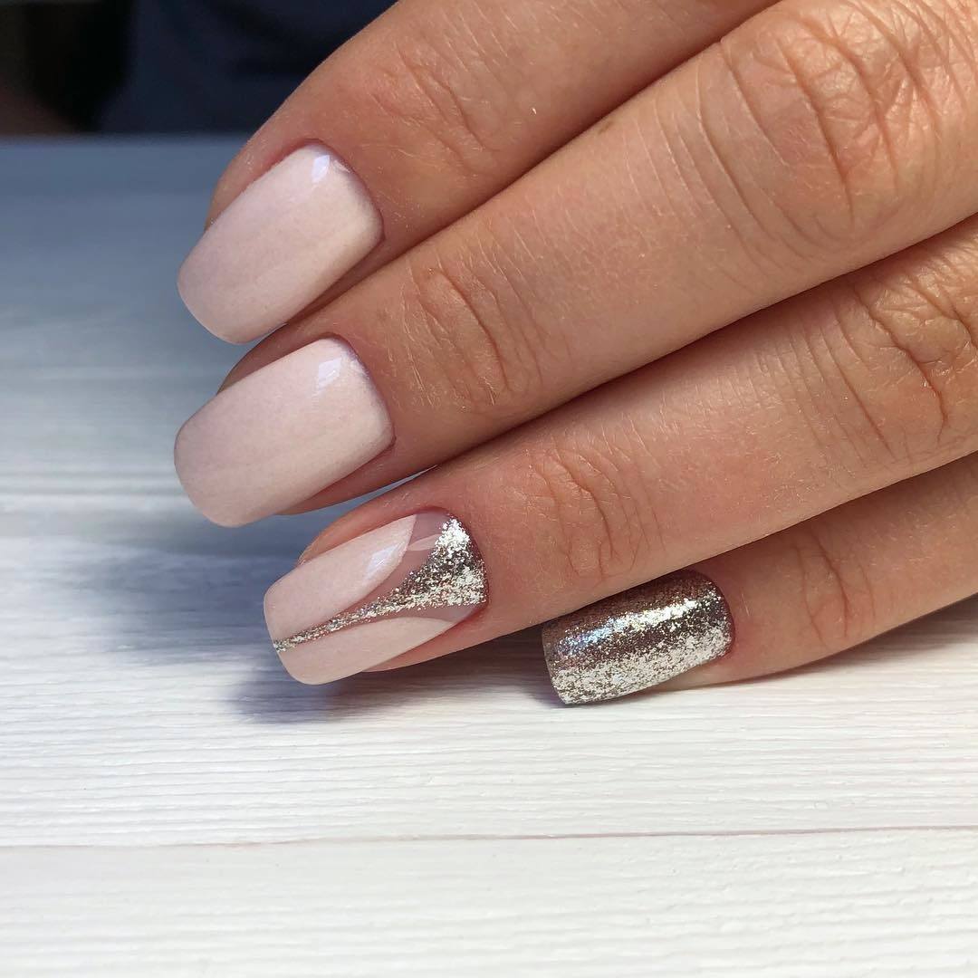 Нежно-бежевые ногти, украшенные серебряными, золотыми, розовыми, черными, синими, красными или фиолетовыми блестками, выглядят непринужденно и изысканно. Это сочетание лаковой основы и блесток подходит для любого стиля и любого типа кожи. Чтобы внести разнообразие в маникюр, можно нанести матовое покрытие.
