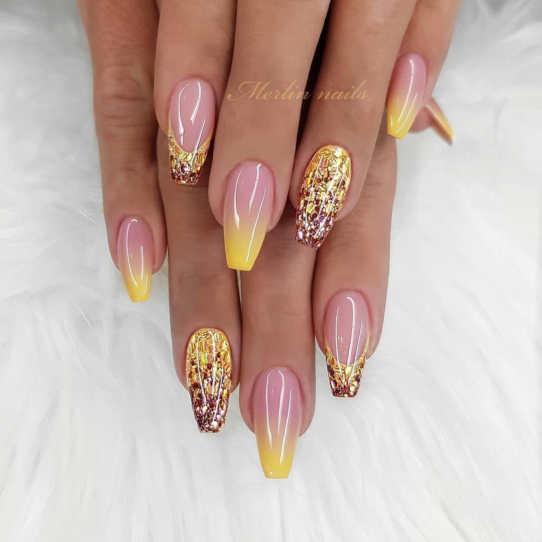 Маникюр с золотым блеском – это почти синоним праздничного настроения. Используйте это свойство золотого лака для ногтей без особого случая, просто чтобы разнообразить свой повседневный образ.