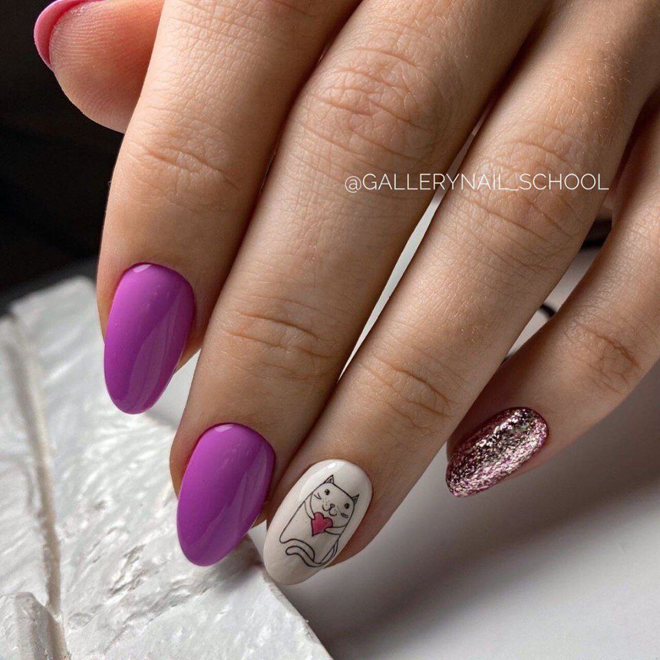 Особенно интересным будет подобный маникюр, если один из ногтей дополняется блестками в тон или полностью покрывается жидким глиттером того же цвета. Подобный вариант декора ногтей считается более спокойным, чем радужный, а значит может подойти как для праздников, так и в качестве повседневного варианта.