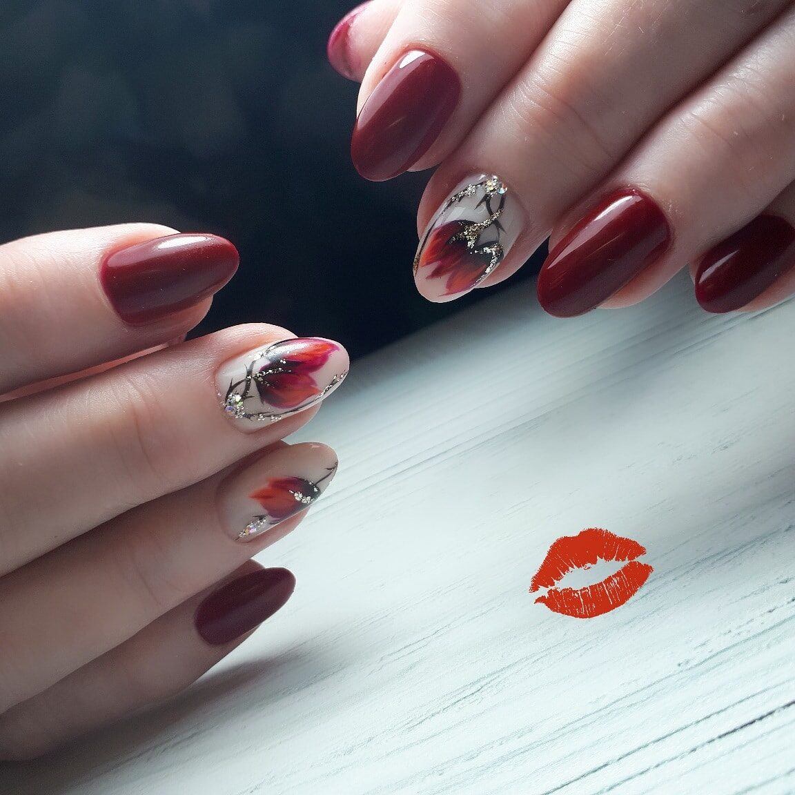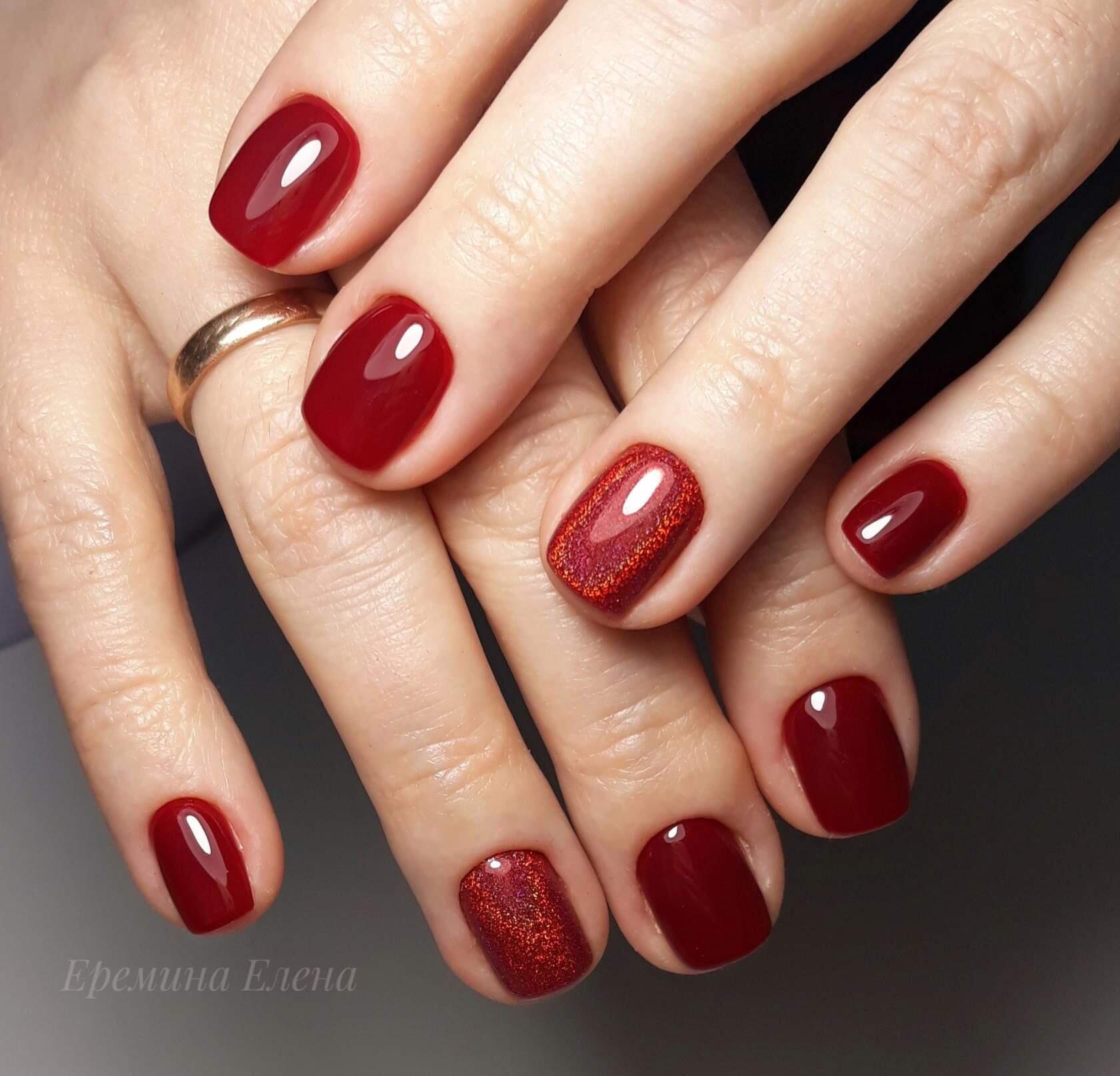 Алые, пурпурные, малиновые и темно-красные ногти выглядят еще красивее, если они украшены блестками. С помощью блесток можно создать изысканный или страстный маникюр на ногтях любой длины и формы. Однако красные ногти с блестками лучше всего смотрятся на миндалевидных или квадратных ногтях длиной выше средней. Универсальность красного цвета и его оттенков заключается в его высокой сочетаемости почти со всеми оттенками блеска. Золото, серебро, бронза, черный, белый, синий и даже зеленый – со всеми этими цветами можно смело экспериментировать. Интересный красный французский маникюр или лунный маникюр с блестками по четкому контуру – это то, что имеет много характера.