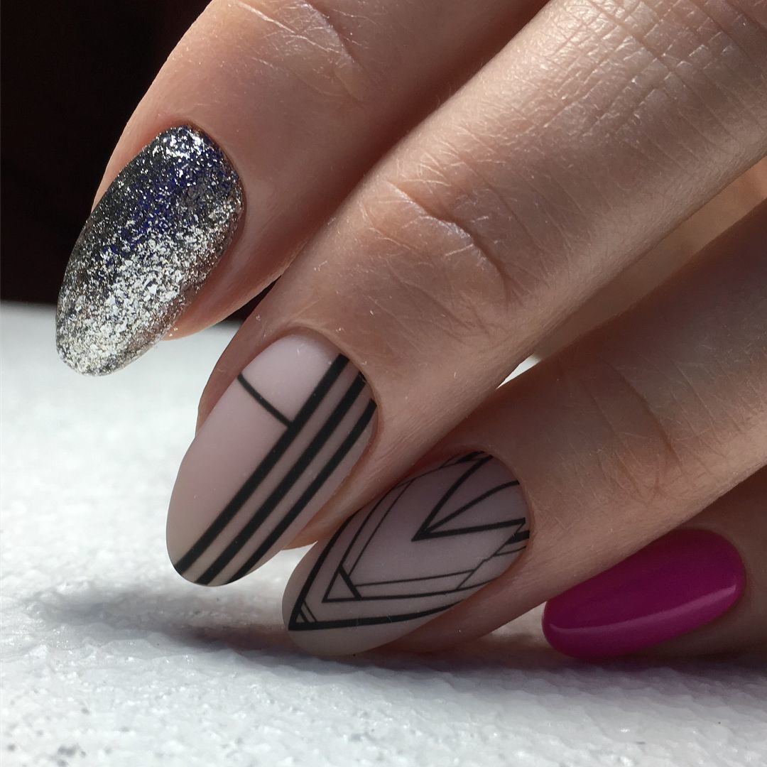 Для завершения этого дизайна необходимо предварительно нанести геометрический узор. Для этого можно использовать длинную щетку для волос, металлическую ленту, тиснение или трафарет. После нанесения дизайна на ногти пространство между линиями заполняется гель-лаком с блестками. Для этого используйте щетку с короткими тонкими волосами. Если у вас нет гель-лака с блестками, вы можете сделать это самостоятельно. Для этого смешайте на палитре рассыпчатые блестки и топ.