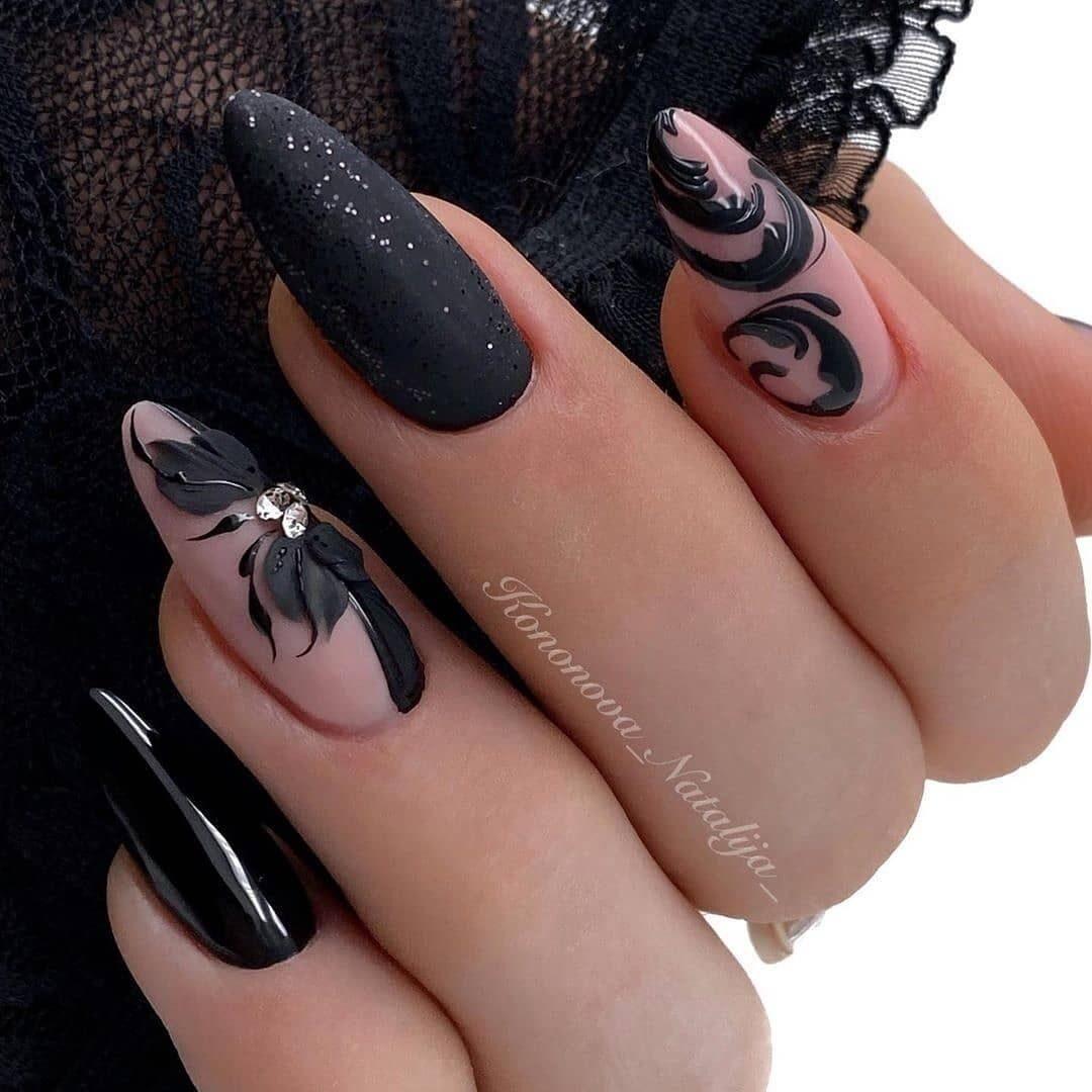 Загадочный и завораживающий маникюр можно сделать на черном фоне с блестками того же цвета. Кроме того, можно использовать как мелкие глиттеры, так и крупные, нанесение которых требует определенных усилий. Но эффект от такого тандема будет более чем оригинальным.