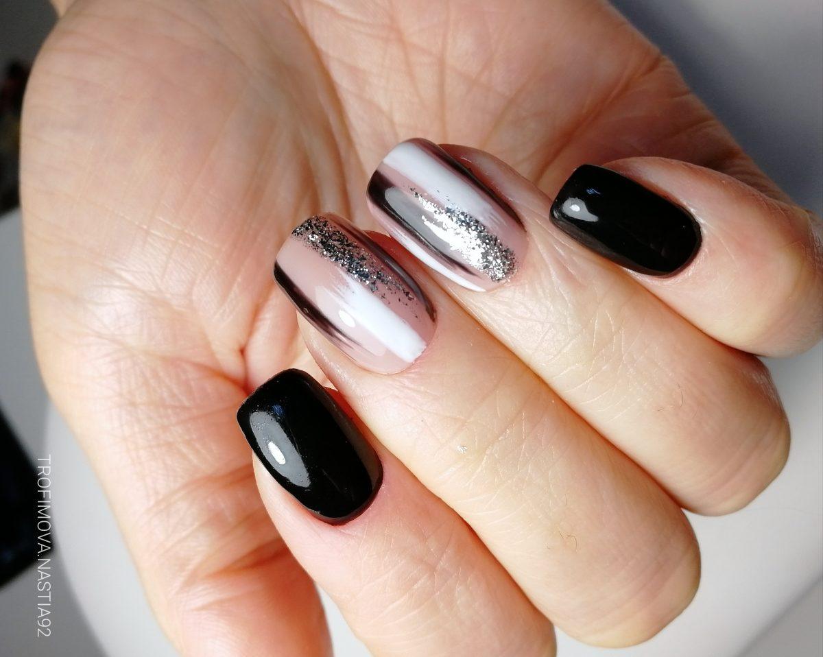 Ансамбль чёрного и яркого мерцания смотрится не менее оригинально, чем предыдущее сочетание. Наиболее распространёнными вариациями считаются красное основание с чёрными деталями или чёрное основание с блёстками. Этот тандем может оформляться в виде рисунков, техники френч, амбре, чередования и многих других идей. Можно украсить лак чёрными блестящими камифубуками или использовать в маникюре другие оттенки блестящего декора.