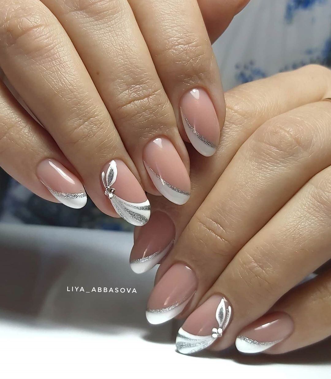 Очень стильно и празднично смотрится белый френч с отпечатками серебристой, золотой или красной фольги.