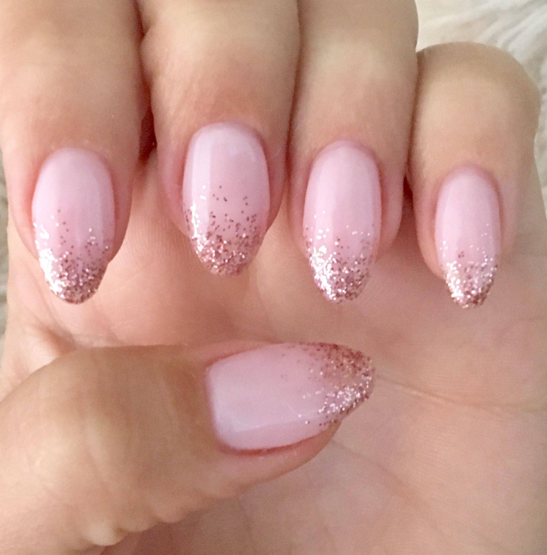 Идею сочетания розового лака с блестящими частицами можно уверенно отнести к одним из самых стильных и женственных примеров, которые будут актуально смотреться в любой ситуации и в любое время года. Подобный вид оформления особенно интересно проявляет себя в компании с овальной формой ногтевых пластин, являющейся беспроигрышным решением для большинства дам