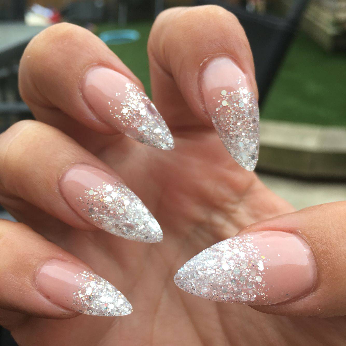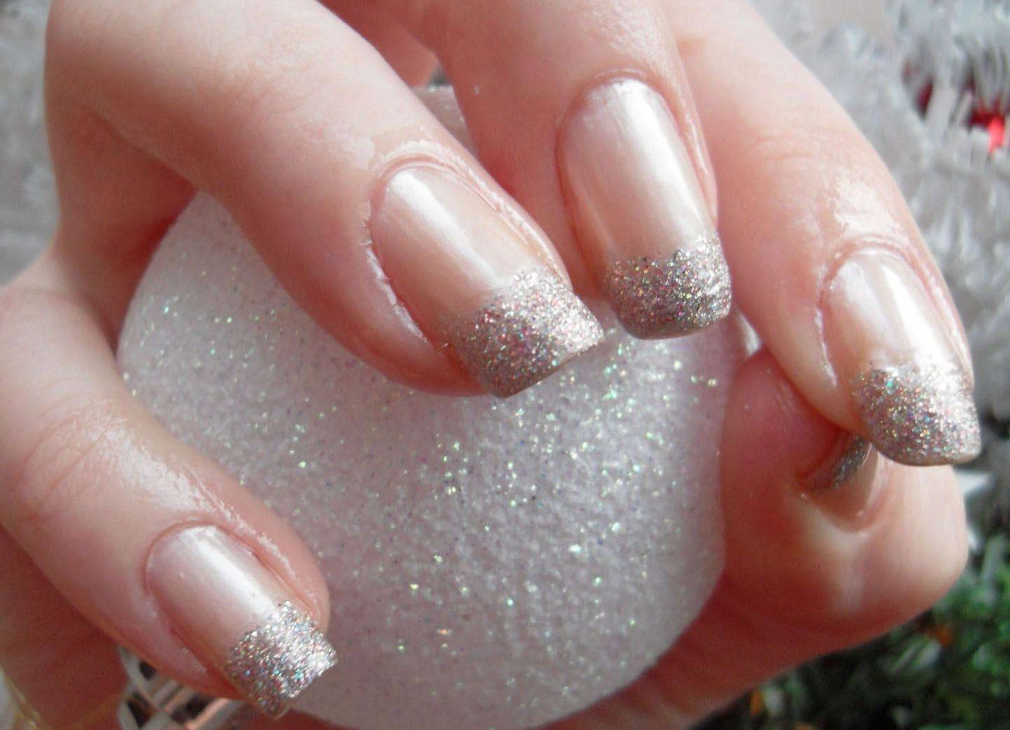 - Французский маникюр тоже можно дополнить блестками, например, выделив ими линию улыбки. Это будет выглядеть нежно и стильно.