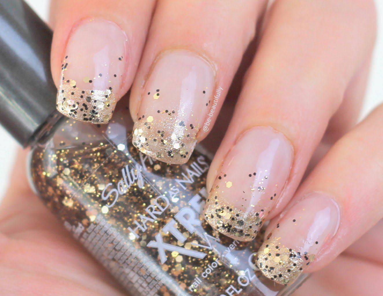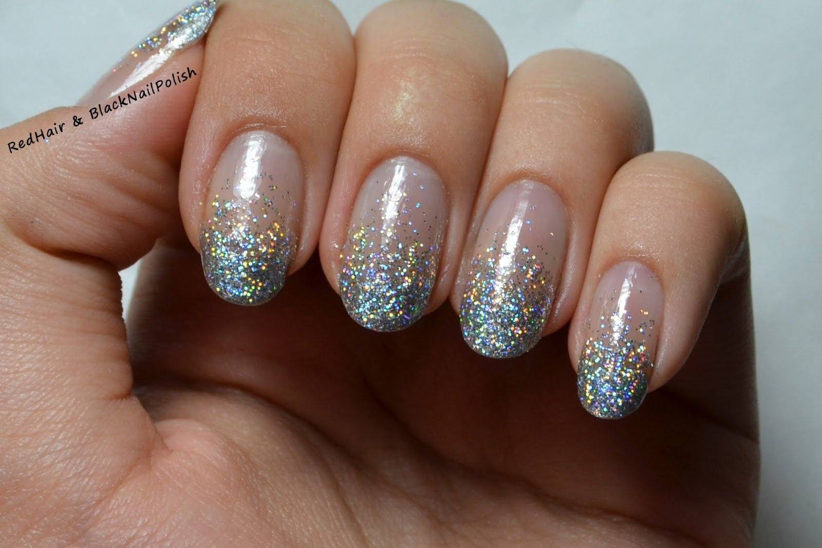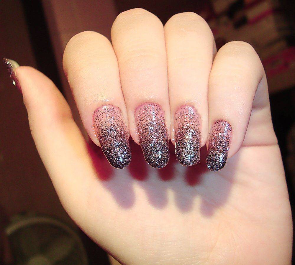 С помощью блесток можно создать на ногтях и модный эффект омбре (растяжка цвета или блеска). Чаще всего в этом случае максимальное количество блесток располагают на свободном крае и уменьшают его по направлению к основанию ногтя. Выполнять растяжку удобнее жидким глиттером, так как создать плавный переход сухими блестками довольно сложно. Если же у вас нет жидких блесток, размешайте сухие в прозрачном лаке и тонкой кистью аккуратно выполните растяжку от края ногтя к основанию. Для удачного результата лучше выбирать мелкий однородный глиттер. Особенно эффектно с растяжкой блестками смотрятся нюдовые оттенки, а также яркие цвета: черный, красный, синий.