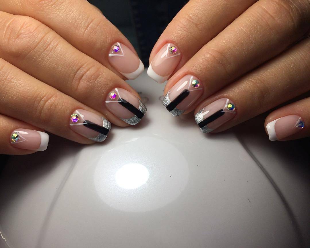 - Французский маникюр, дополненный стразами и блестками, заиграет новыми оттенками элегантности.