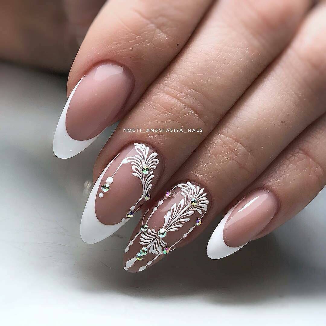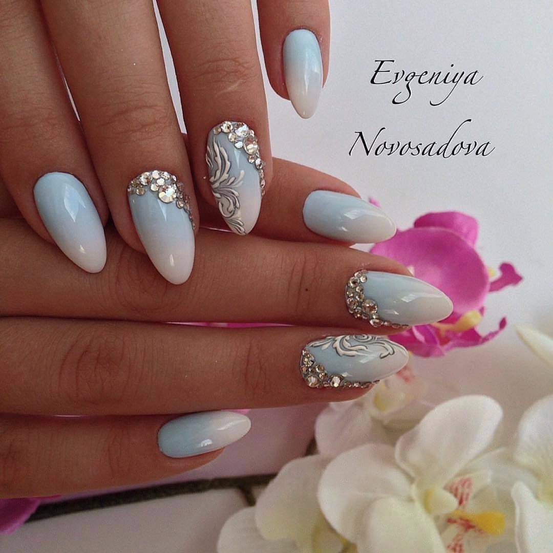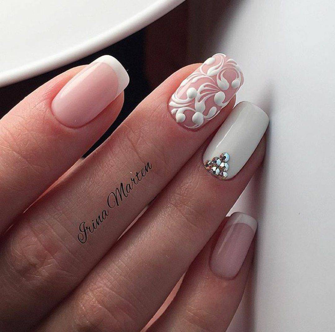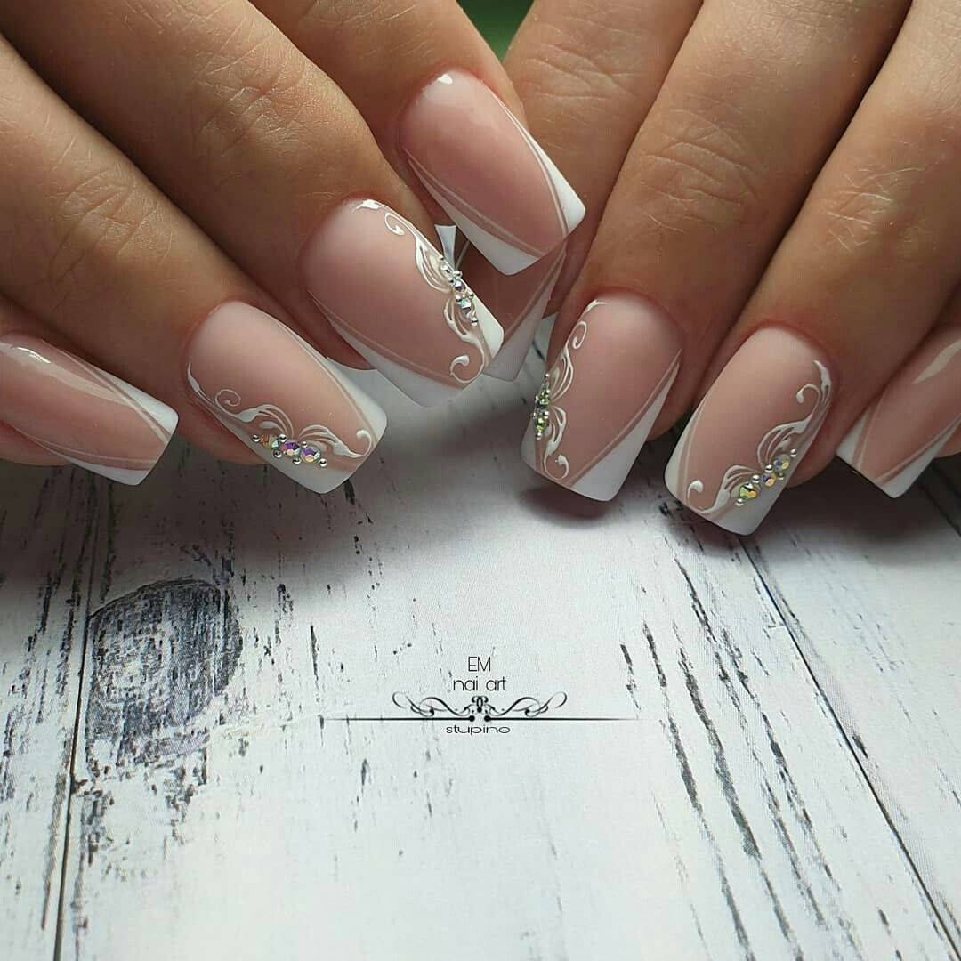 Именно свадебный маникюр со стразами практически не имеет ограничений, ведь здесь можно играть с фактурами, количеством и цветами камушков, узорами и рисунками гель лаком и лепкой.