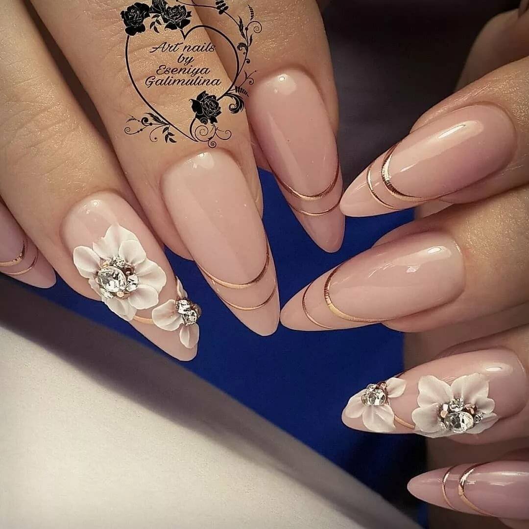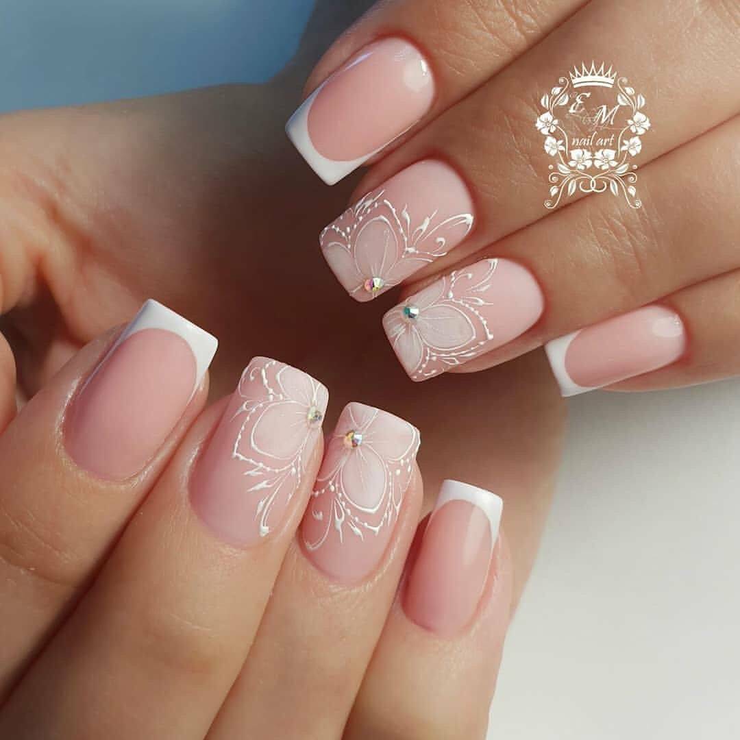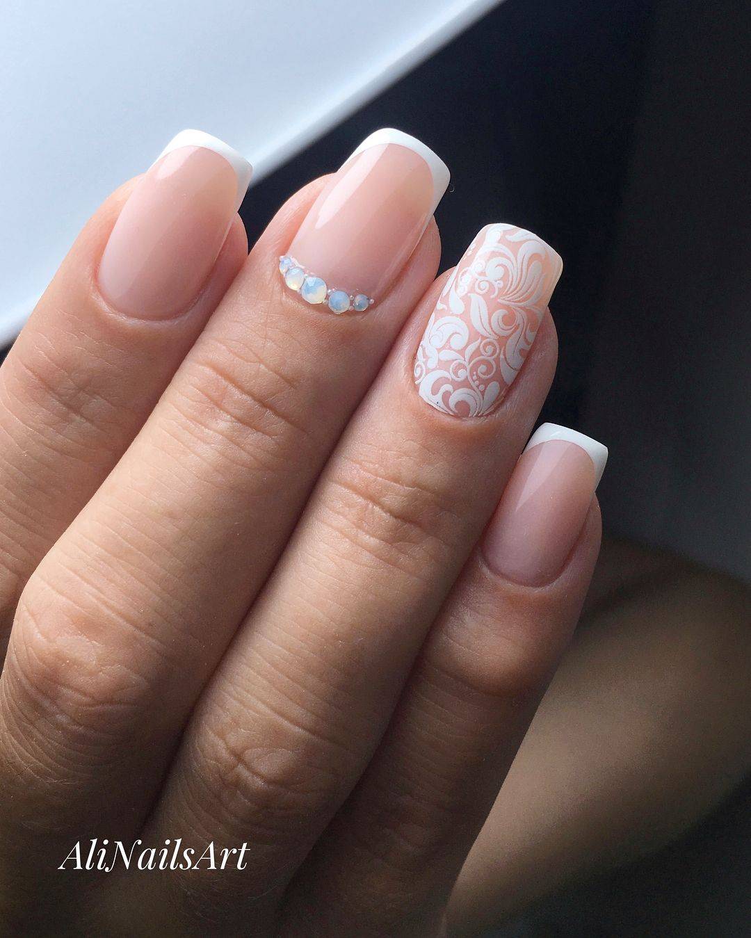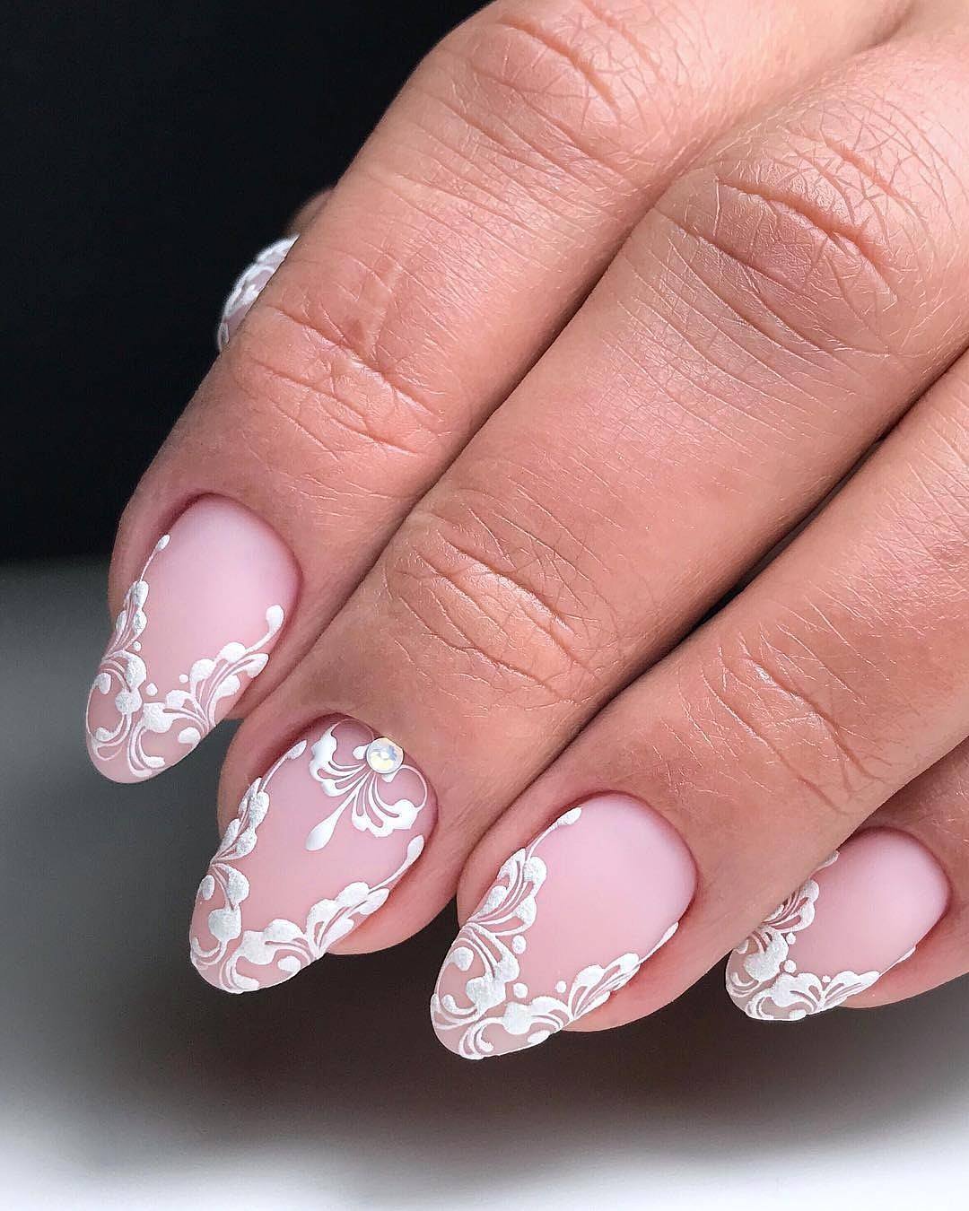 Именно свадебный маникюр со стразами практически не имеет ограничений, ведь здесь можно играть с фактурами, количеством и цветами камушков, узорами и рисунками гель лаком и лепкой.
