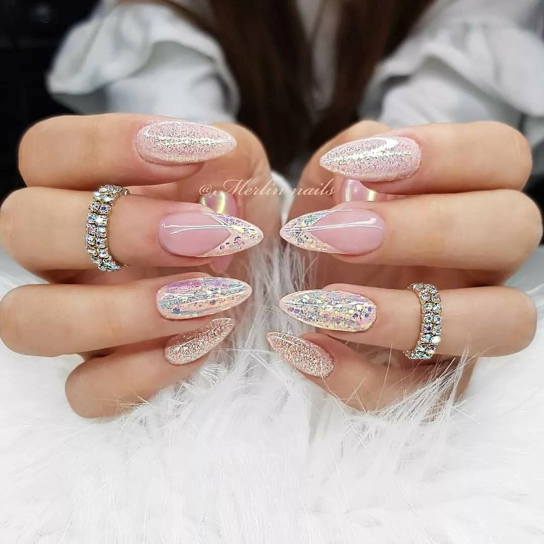 Блестящий декор желательно располагать на 1-2 пальцах руки. Эффектно смотрится дизайн с крупными блестками, с пайетками. Что касается основного оттенка маникюра, то можно использовать как пастельные тона: розовый, бежевый, серый и другие, так и черный, бордовый, насыщенный красный, синий цвета.