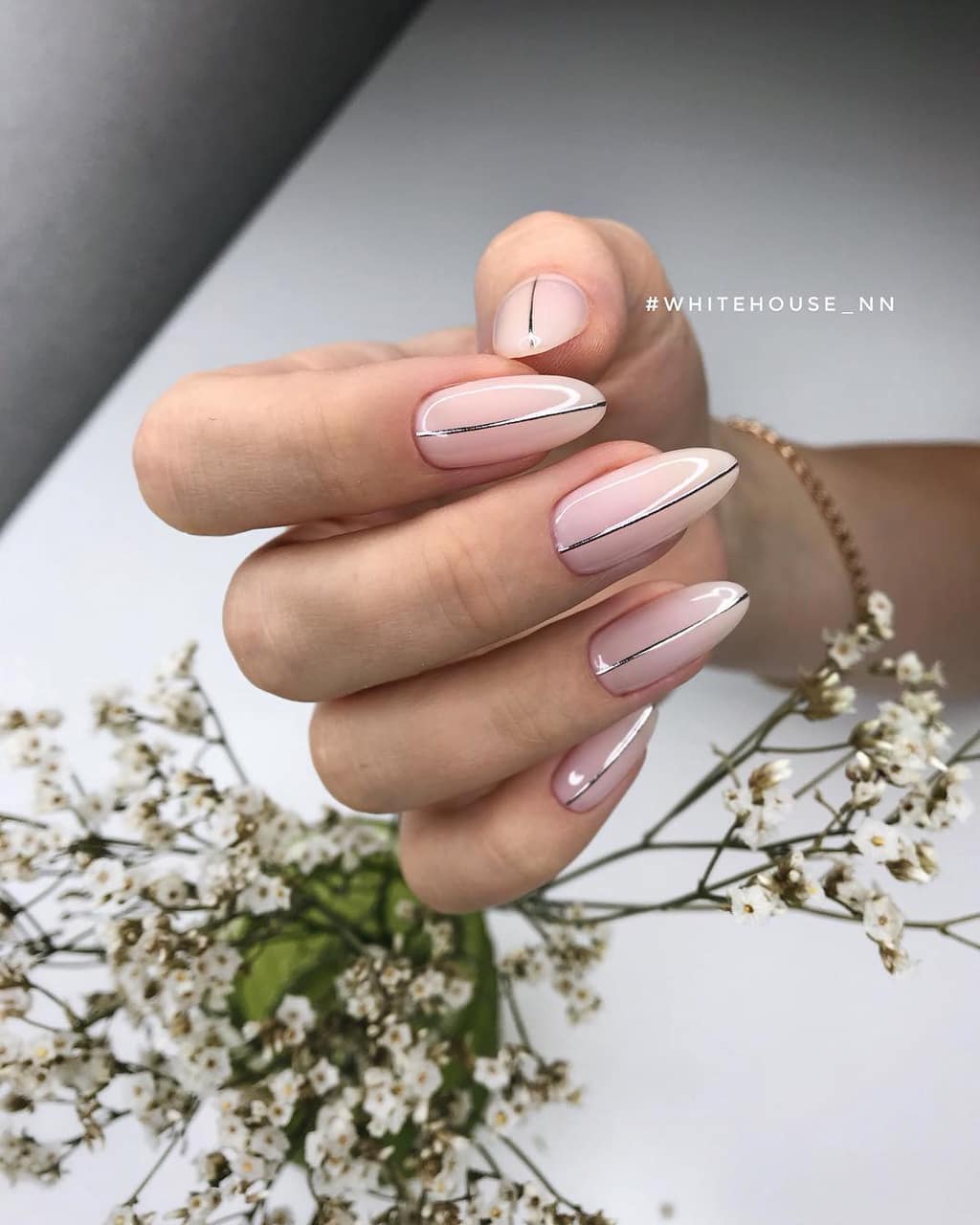 В 2020 году стоит присмотреться к геометрическому дизайну. Тонкие линии, фигуры и точки – все это можно использовать для создания бесчисленного количества рисунков на любой вкус. К тому же, многое зависит от техники нанесения. В домашних условиях использовать кисти не всегда удобно. Выбирайте стемпинг для симметричности. С помощью блесток можно подчеркнуть одну-две линии, что сделает дизайн чуть более ярким.