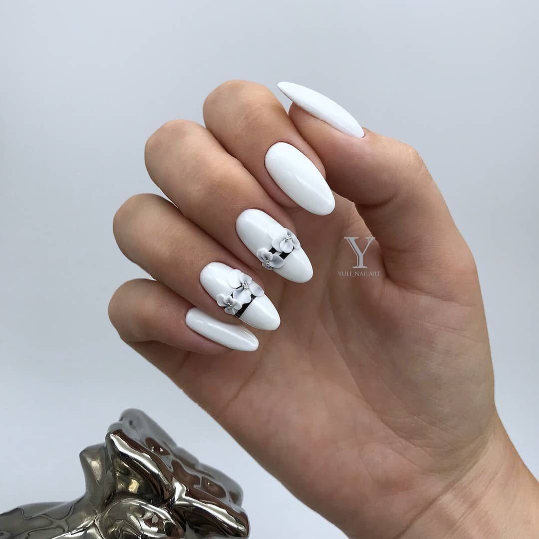 Традиционный светлый тон можно заменить ярким. Для украшения летнего маникюра 2021 в ход идут стразы, цветные камушки, рисунки, которые лучше наносить на один-два ногтя.