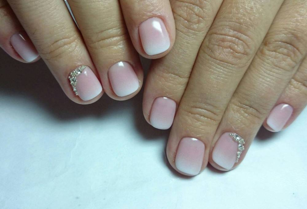 - французский маникюр с добавлением сверкающих элементов на кончик ноготка, сделав узор выпуклым;